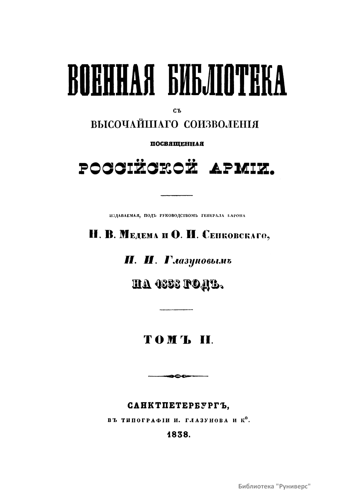 Военная библiотека, съ высочайшаго соизволенiя посвященная российской армiи. Томъ II