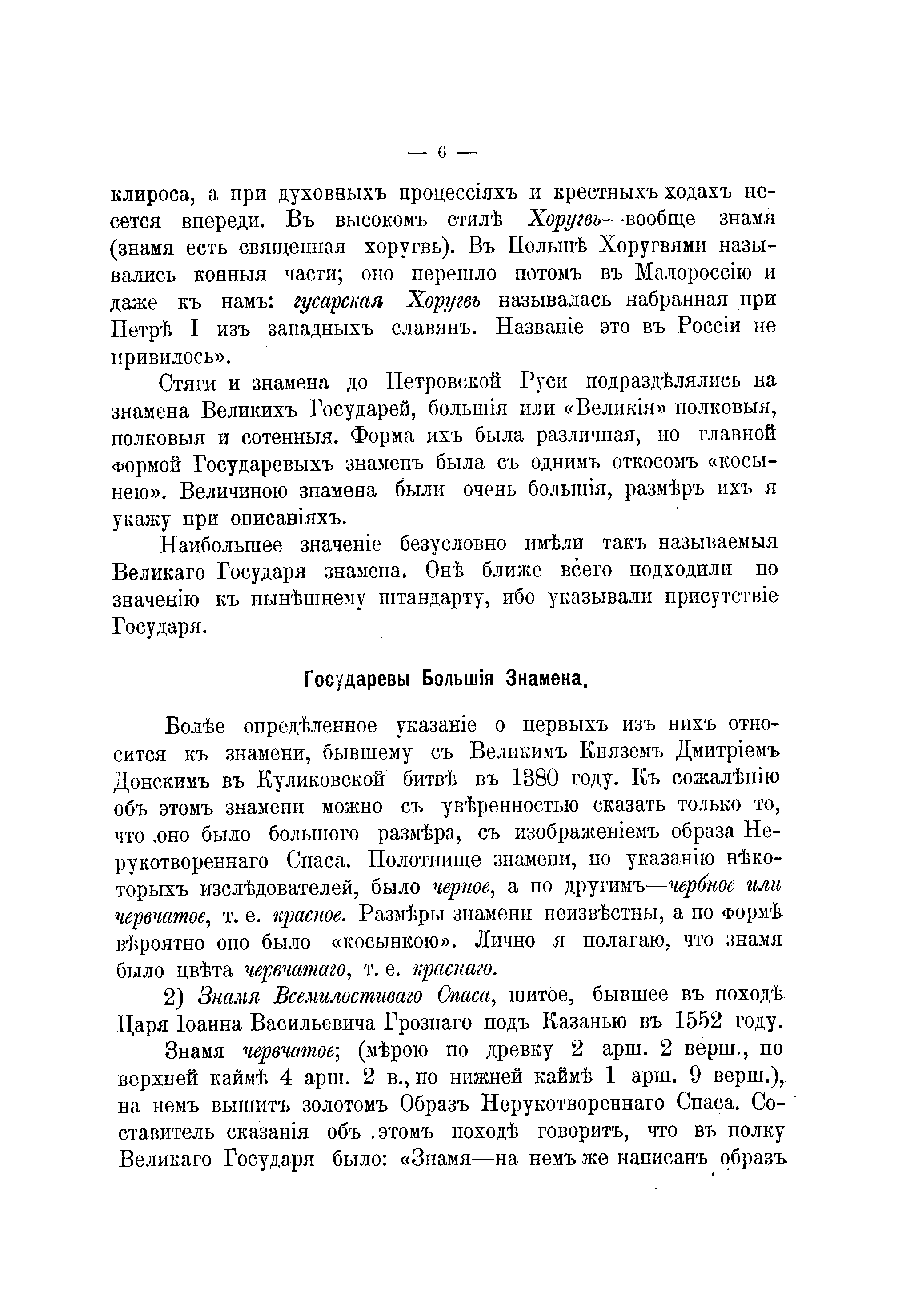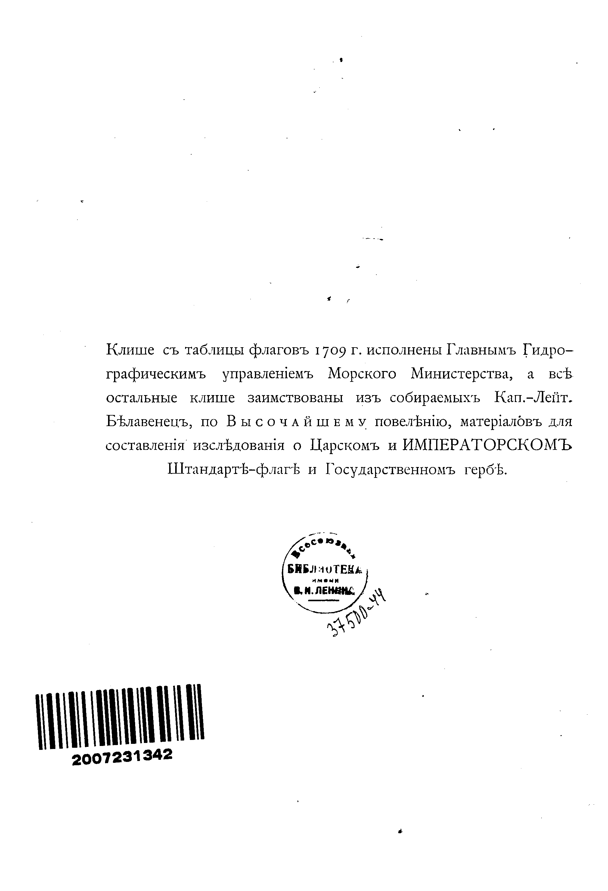 Краткий популярный очерк известного специалиста по военной и военно-морской истории России посвящен описанию знамён, начиная с хоругвей и стягов времён великого князя Дмитрия Донского (в XIV в.) до знамён, принятых в полках Российской императорской армии в эпоху Александра I. В брошюре приведено описание более 320 русских знамён различных периодов российской истории, особое внимание сосредоточено на знамёнах петровского времени. В правление последнего российского императора Николая II в придворных кругах широко обсуждалась проблема национальных цветов. Капитан-лейтенант Белавенец П.И, являясь членом Особого совещания при Министерстве юстиции для выяснения вопроса о русских государственных национальных цветах в 1910-1912 гг., весьма плодотворно занимался геральдикой, историей знамен и флагов. В ходе работы Совещания, и в печати велась острая полемика между сторонниками бело-сине-красного и черно-золото-белого флагов. Сторонниками первого был П.И. Белавенец, доставивший бело-сине-красное знамя Петра Великого, хранившееся в Архангельске и собравший сведения о русских знаменах, захваченных шведами под Нарвой, переиздавший и прокомментировавший книгу К. Алярда о флагах (Амстердам, 1695; Москва, 1709), а затем составивший специальную записку о русских знаменах. Результатом этой деятельности и стало данное издание.
