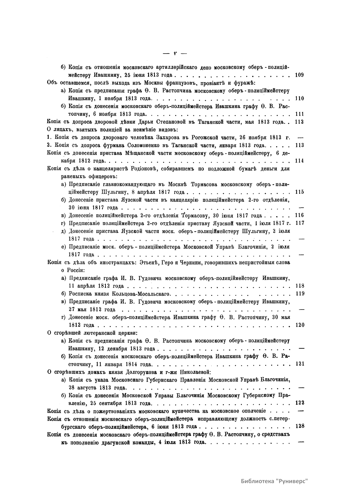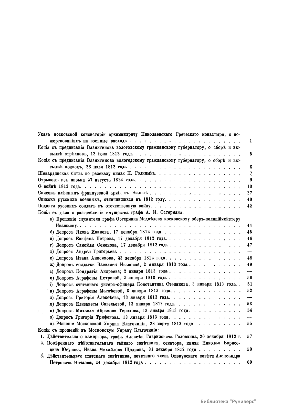 Многочисленные документы, собранные и изданные П.И. Щукиным, относятся к Отечественной войне 1812 года. В издании опубликованы донесения, отчеты, указы, описи, письма разных лиц, протоколы, постановления, предписания, прошения и т.д. В этих бумагах содержатся подробности, которые невозможно встретить ни в одном учебнике истории и которые, будучи собранными вместе, и составляют подлинную картину российской истории начала XIX века.