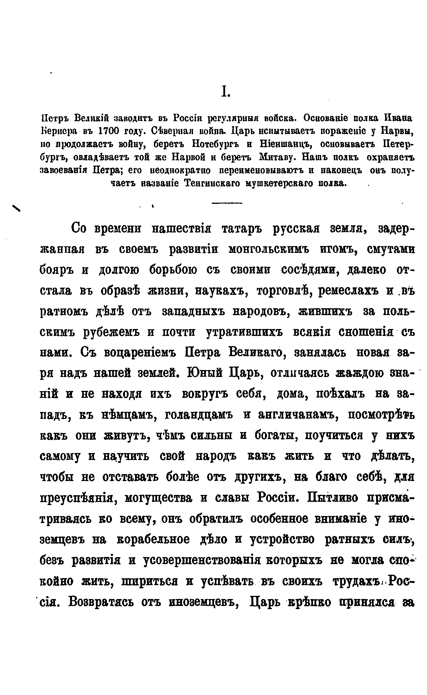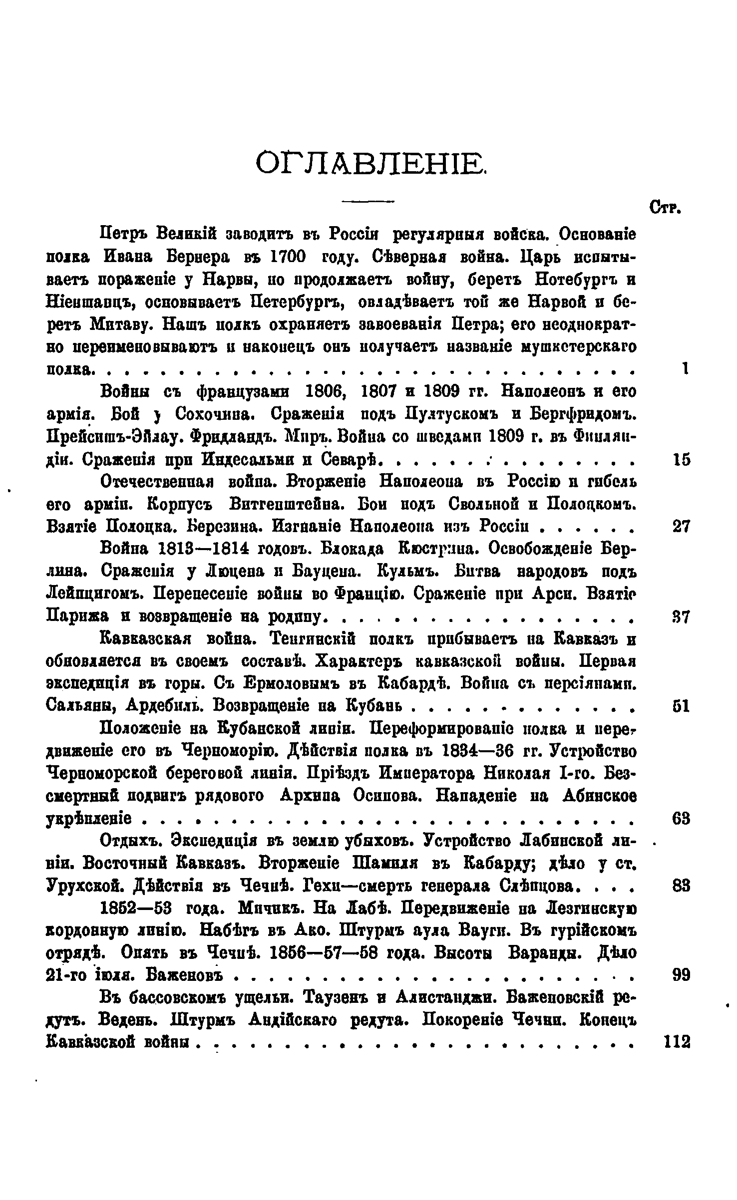 Документальное описание боевых действий полка и знаменательных исторических событий, связанных с ним, за период 1700 – 1900 годов. Приведены поименные списки командиров, офицеров, классных чиновников полка.