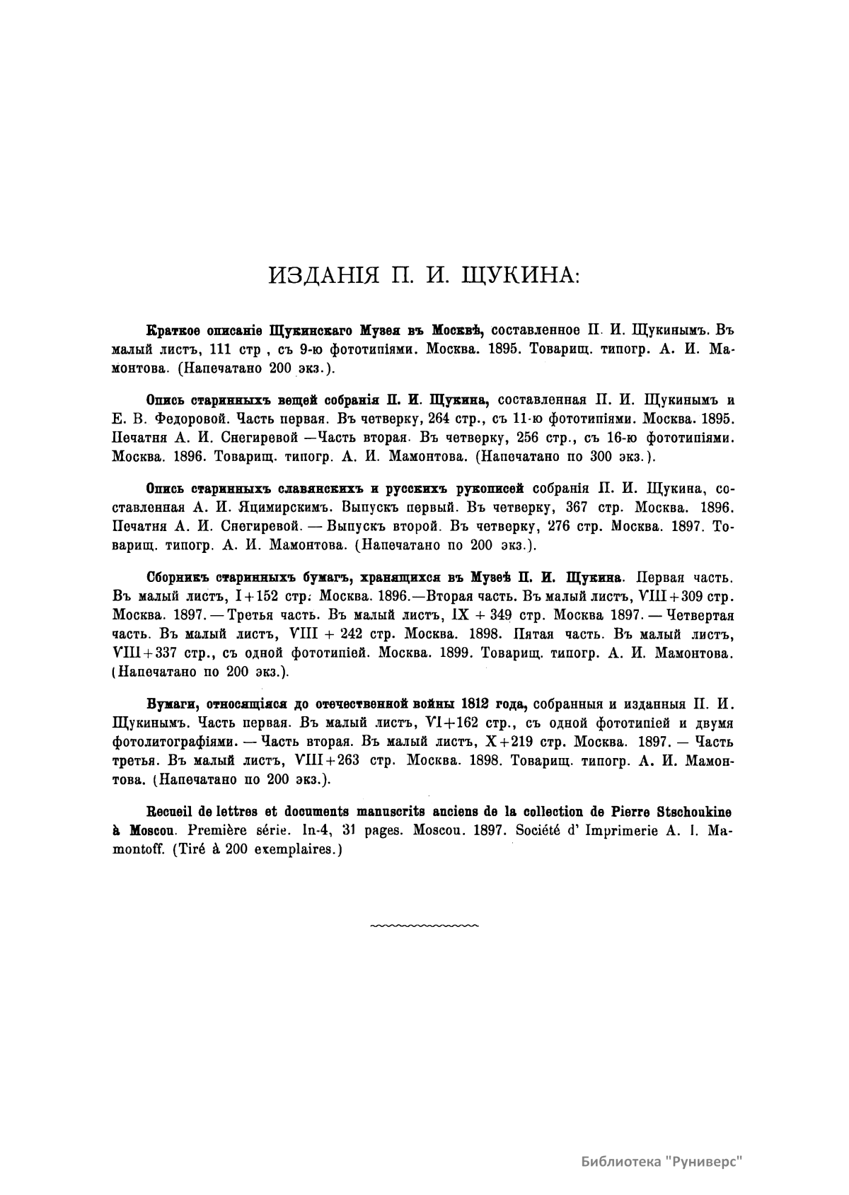Многочисленные документы, собранные и изданные П.И. Щукиным, относятся к Отечественной войне 1812 года. В издании опубликованы донесения, отчеты, указы, описи, письма разных лиц, протоколы, постановления, предписания, прошения и т.д. В этих бумагах содержатся подробности, которые невозможно встретить ни в одном учебнике истории и которые, будучи собранными вместе, и составляют подлинную картину российской истории начала XIX века.