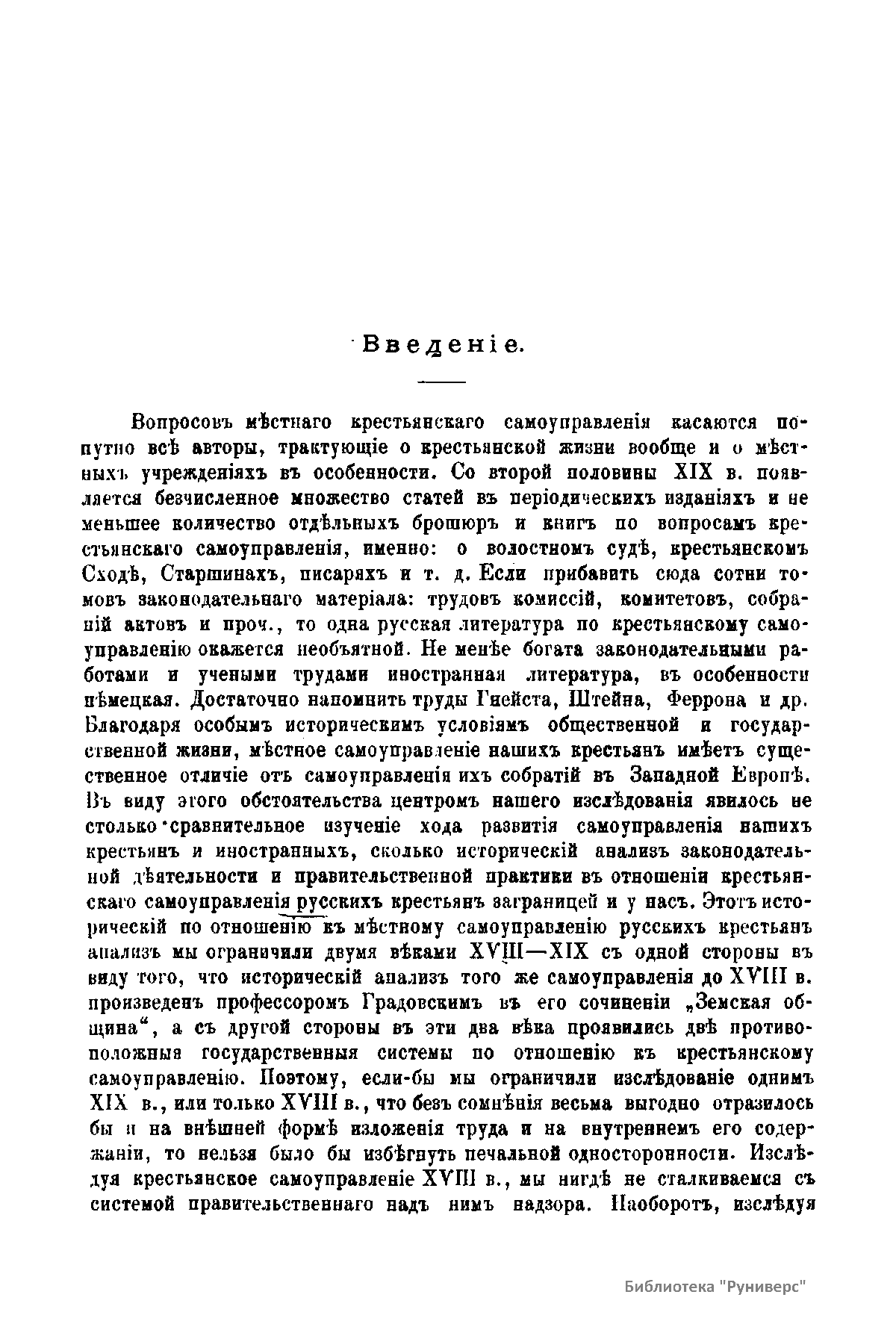 Исследование является сжатым конспектом тысячи томов законодательного и незаконодательного материала. В нем представлены результаты изучения хода развития самоуправления русских крестьян, а также исторический анализ законодательной деятельности и правительственной практики в отношении крестьянского самоуправления за границей и в России. Анализ ограничен двумя веками: восемнадцатым и девятнадцатым, так как именно в это время проявились две противоположные государственные системы в отношении крестьянского самоуправления. В восемнадцатом веке, в отличие от девятнадцатого, отсутствует система правительственного надзора над самоуправлением крестьян.