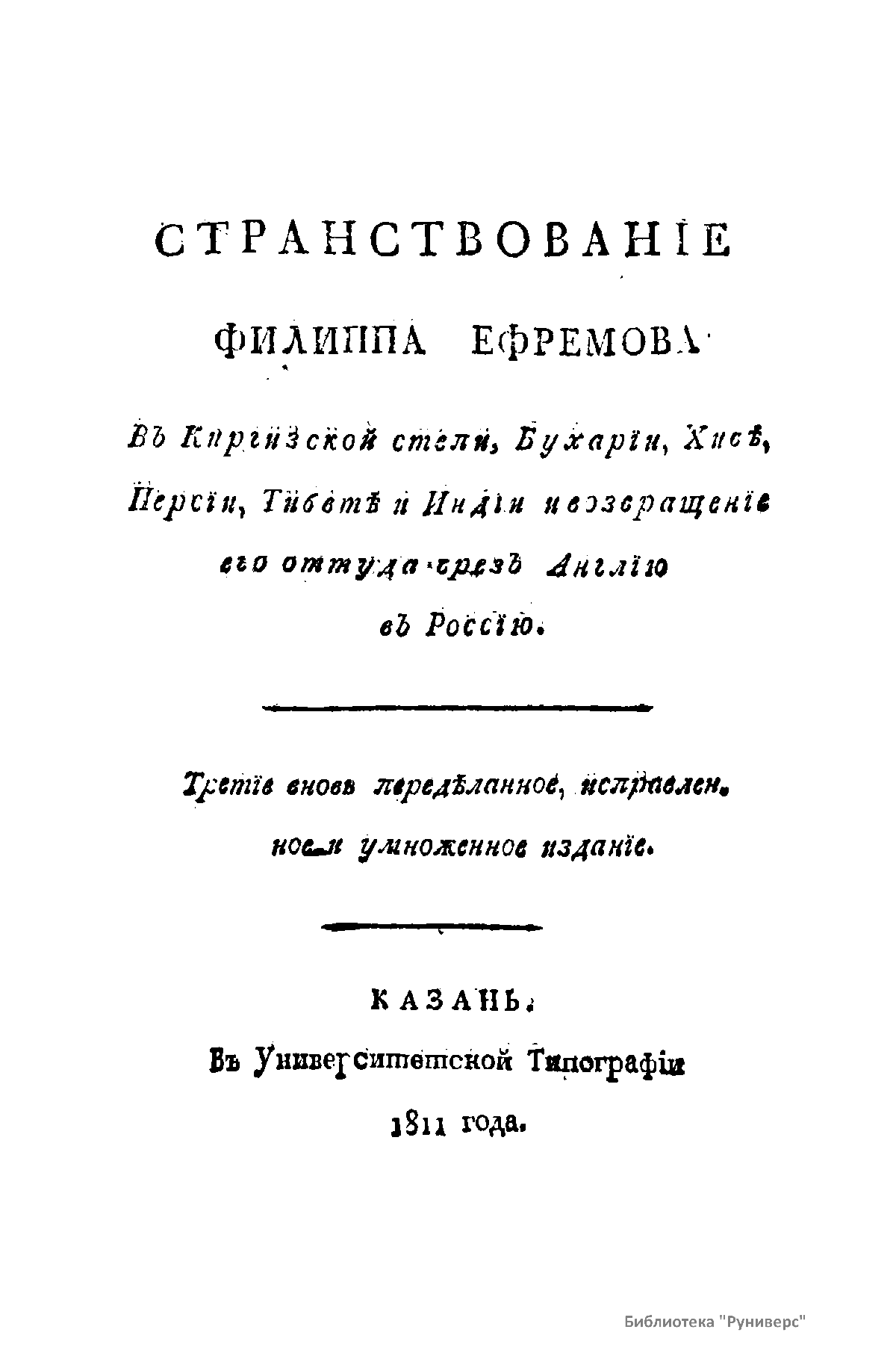 Странствование Филиппа Ефремова в Киргизской степи, Бухарии, Хисе, Персии, Тибете и Индии и возвращение его оттуда чрез Англию в Россию