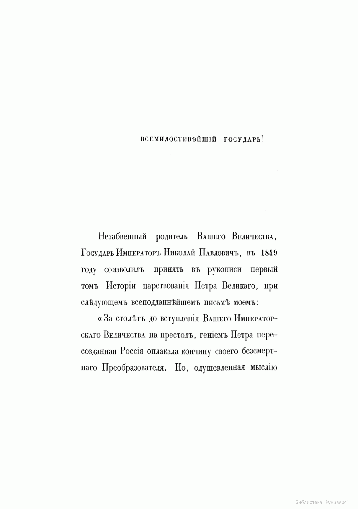 Устрялов Николай Герасимович (1805–1870) — профессор Петербургского университета, академик Императорской Академии наук. Самым важным трудом, которому Устрялов посвятил последние 23 года жизни, была «История царствования Петра Великого». Для ее создания автор использовал множество важных источников из государственного архива. Его труд остался незаконченным, но, несмотря на это, явился крупнейшим историческим исследованием.