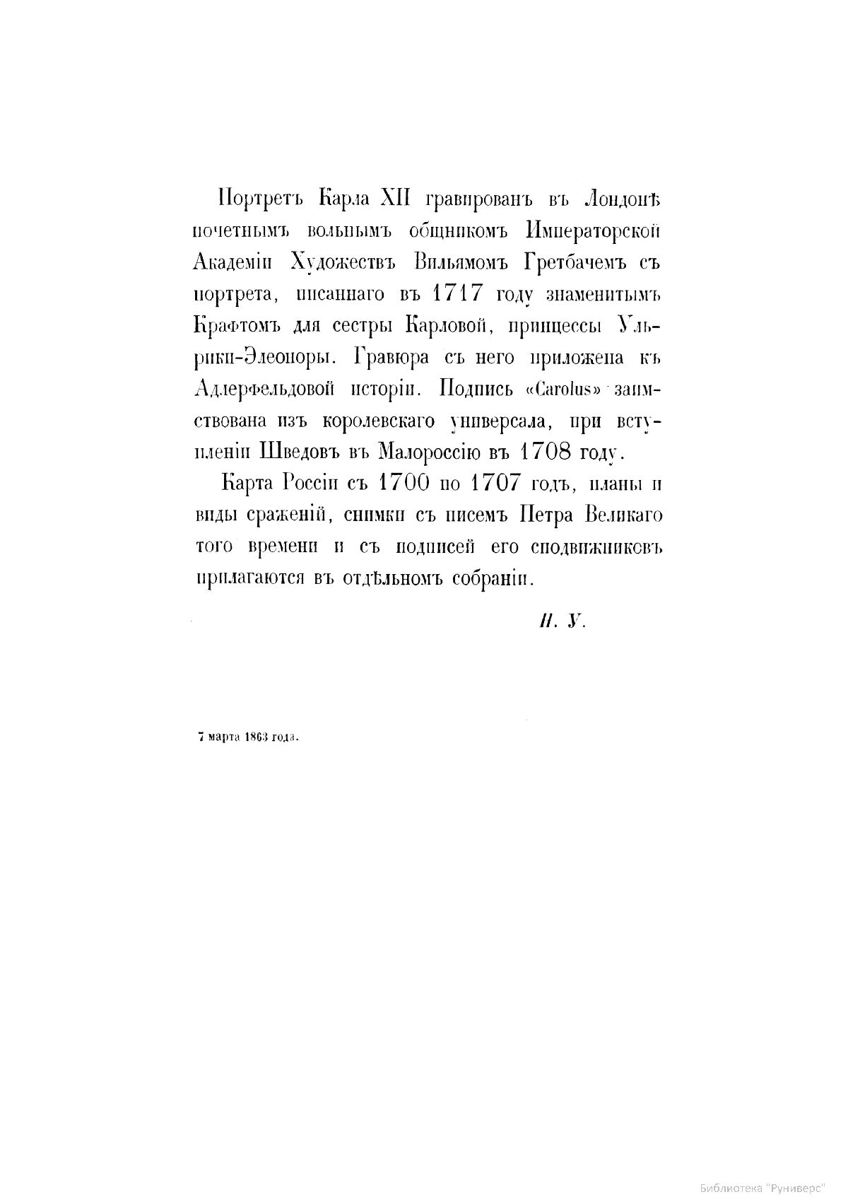 Устрялов Николай Герасимович (1805–1870) — профессор Петербургского университета, академик Императорской Академии наук. Самым важным трудом, которому Устрялов посвятил последние 23 года жизни, была «История царствования Петра Великого». Для ее создания автор использовал множество важных источников из государственного архива. Его труд остался незаконченным, но, несмотря на это, явился крупнейшим историческим исследованием.