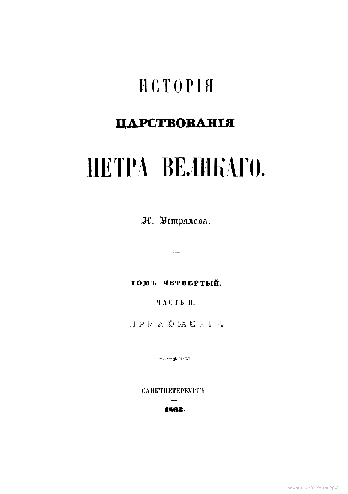 Устрялов Николай Герасимович (1805–1870) — профессор Петербургского университета, академик Императорской Академии наук. Самым важным трудом, которому Устрялов посвятил последние 23 года жизни, была «История царствования Петра Великого». Для ее создания автор использовал множество важных источников из государственного архива. Его труд остался незаконченным, но, несмотря на это, явился крупнейшим историческим исследованием.
