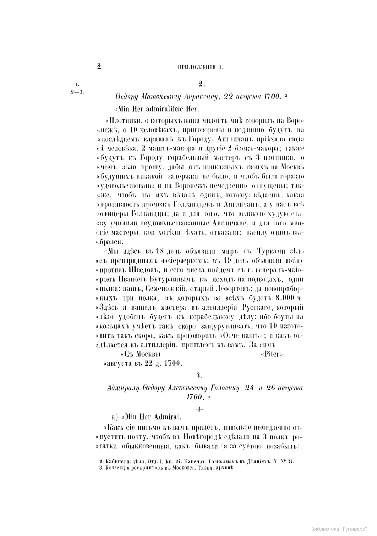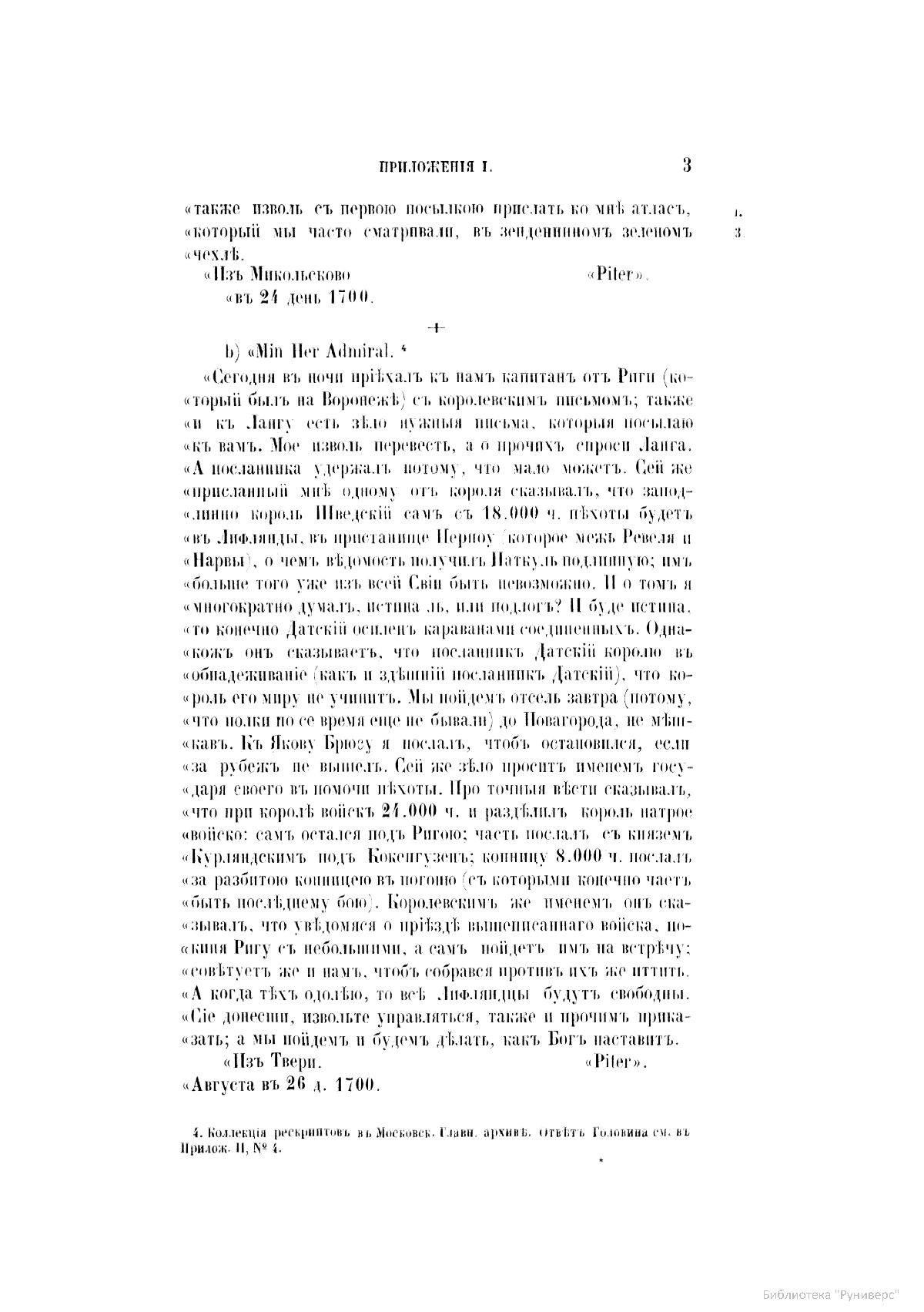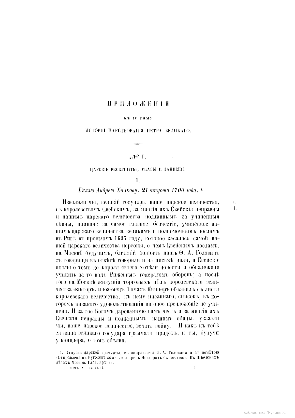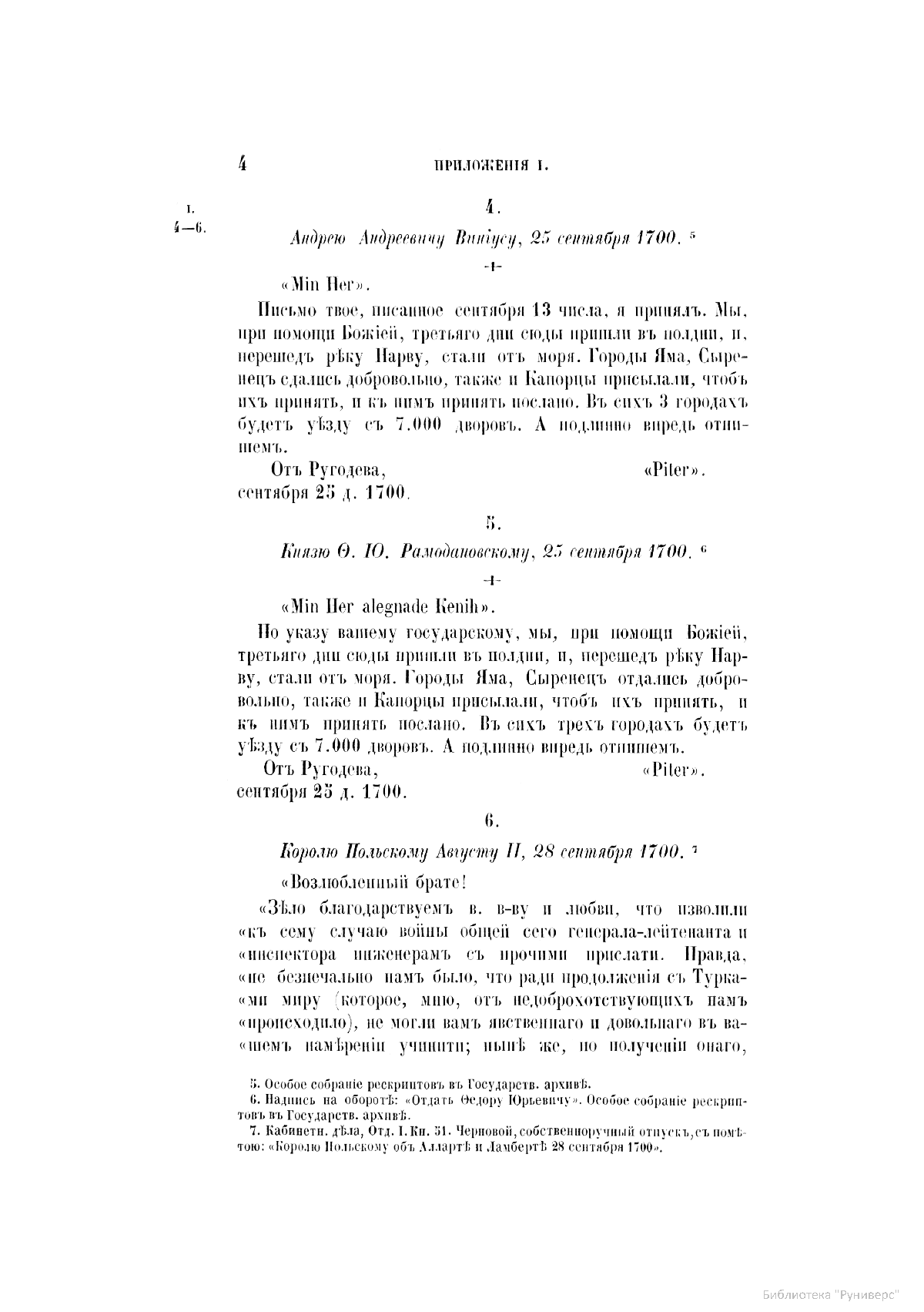 Вторая часть четвертого тома «Истории...» — «Приложения» — содержит более 770 списков с подлинных актов из Государственного архива Санкт-Петербурга, Главного архива Москвы, Тайного государственного архива Вены, архивов Правительствующего Сената, Морского министерства, Императорской Академии наук.