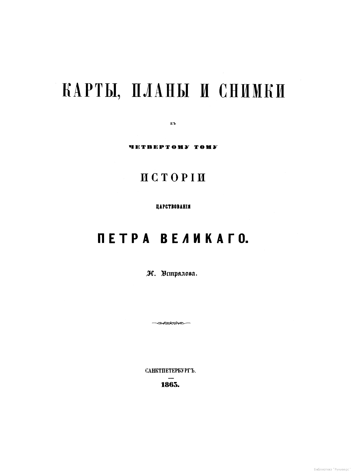 Устрялов Николай Герасимович (1805–1870) — профессор Петербургского университета, академик Императорской Академии наук. Самым важным трудом, которому Устрялов посвятил последние 23 года жизни, была «История царствования Петра Великого». Для ее создания автор использовал множество важных источников из государственного архива. Его труд остался незаконченным, но, несмотря на это, явился крупнейшим историческим исследованием.