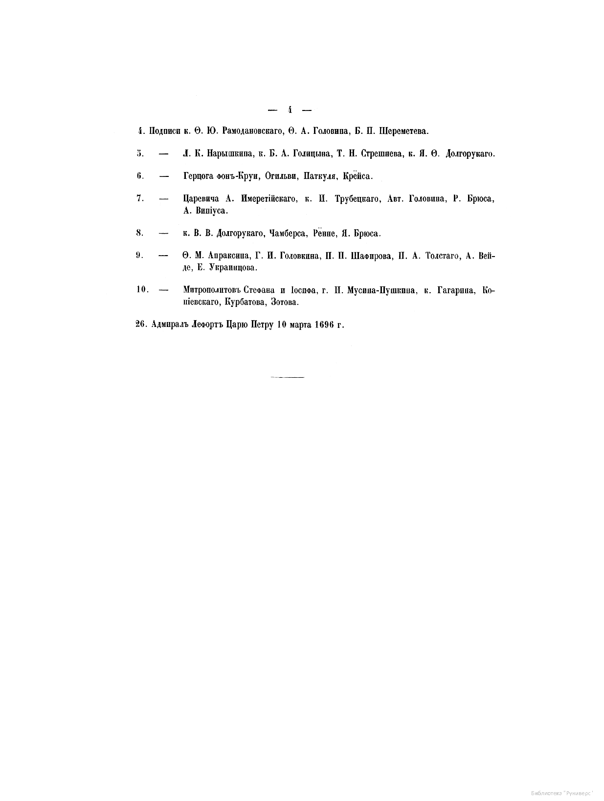 Вторая часть четвертого тома «Истории...» — «Приложения» — содержит более 770 списков с подлинных актов из Государственного архива Санкт-Петербурга, Главного архива Москвы, Тайного государственного архива Вены, архивов Правительствующего Сената, Морского министерства, Императорской Академии наук.