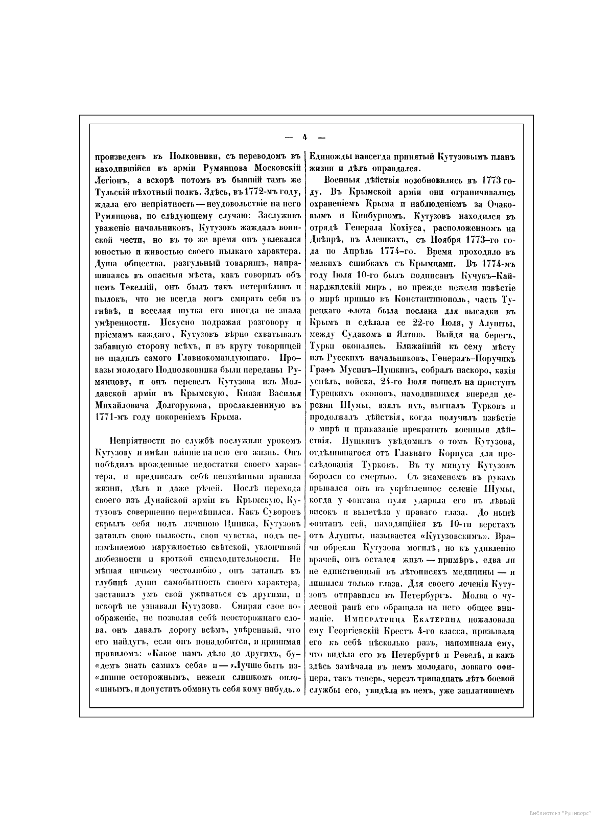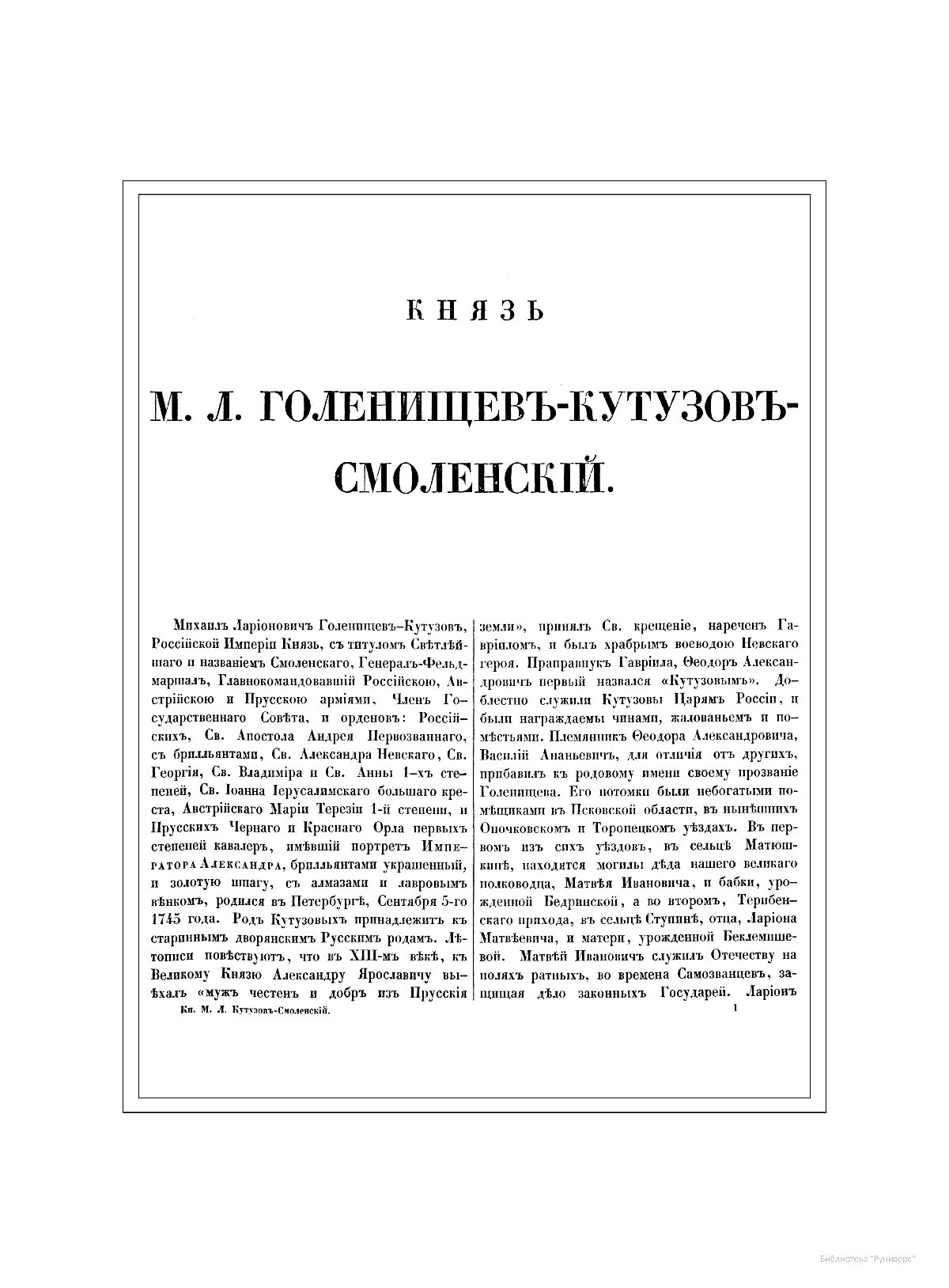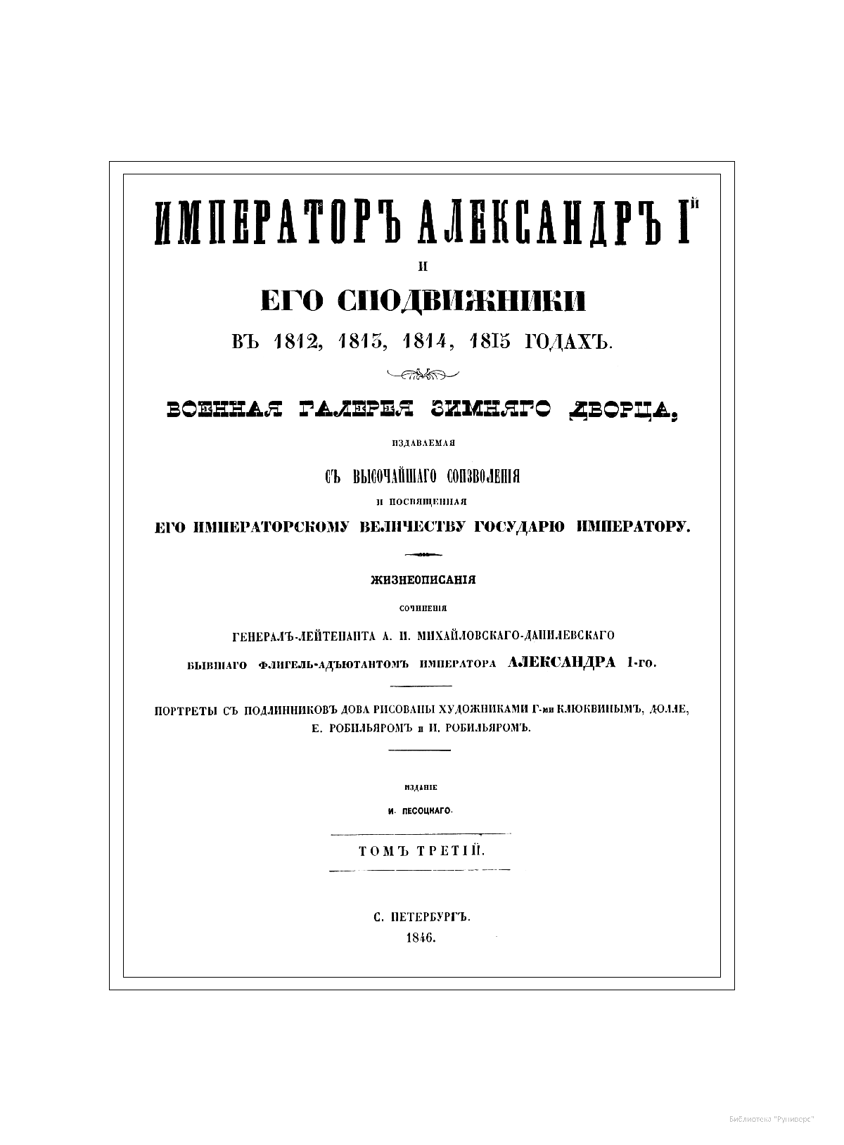 Александр Иванович Михайловский-Данилевский (1790–1848) — участник Отечественной войны 1812 г., генерал-лейтенант, военный историк и академик Санкт-Петербургской академии наук. Автор многих трудов по истории войн Российской империи. В последние годы своей жизни А. И. Михайловский-Данилевский был главным редактором «Военной галереи Зимнего дворца». Война 1812 г. получила название Отечественной и стала ярчайшей страницей российской истории и культуры. В Зимнем дворце столицы император Александр I повелел создать Военную галерею 1812 г. Ни в одном из дворцов Европы не существовало портретной галереи подобной той, что должна была украсить парадную резиденцию русских императоров. В Военной галерее Зимнего дворца должны были разместиться более 300 портретов, для исполнения которых в Петербург весной 1819 г. приехал известный английский живописец Джордж Доу (Даву). В создании портретной галереи принимали участие и русские художники — В. А. Голике, А. В. Поляков. Торжественное открытие галереи состоялось уже в царствование Николая I, в годовщину изгнания французов из России, 25 декабря 1826 г. Шеститомное издание «Император Александр I и его сподвижники в 1812, 1813, 1814 и 1815 гг.: Военная галерея Зимнего дворца, издаваемая с высочайшего соизволения» выходило на протяжении 1845–1849 гг. в петербургской типографии Карла Крайя. Издание объединило портреты и биографии российских генералов, участвовавших в Отечественной войне и заграничных походах. Главным редактором, а также составителем многих биографий стал А. И. Михайловский-Данилевский. Портреты с живописных оригиналов были гравированы на стали парижскими художниками Гюо и Долле. На страницах издания почетное место отведено императору Александру I, представлены биографии и портреты М. И. Кутузова, М. Б. Барклая-де-Толли, вел. кн. Константина Павловича, А. А. Аракчеева, П. П. Коновницына, Д. П. Немировского, Д. С. Дохтурова, П. И. Багратиона, Н. Н. Раевского, А. П. Ермолова, М. И. Платова и многих других героев. Труд А. И. Михайловского-Данилевского содержит обширный документальный и мемуарный материал, представляет подробное описание и анализ военных действий России и Франции на протяжении Отечественной войны 1812 г.