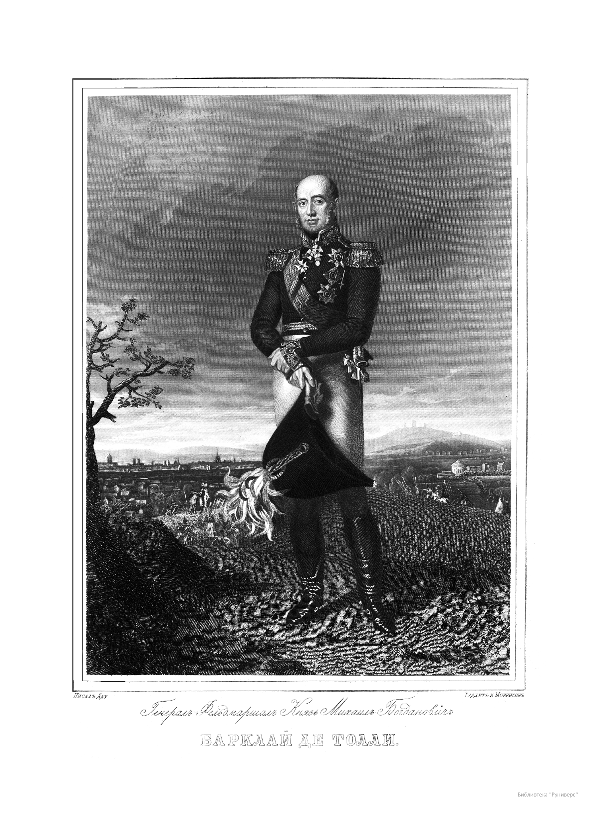Александр Иванович Михайловский-Данилевский (1790–1848) — участник Отечественной войны 1812 г., генерал-лейтенант, военный историк и академик Санкт-Петербургской академии наук. Автор многих трудов по истории войн Российской империи. В последние годы своей жизни А. И. Михайловский-Данилевский был главным редактором «Военной галереи Зимнего дворца». Война 1812 г. получила название Отечественной и стала ярчайшей страницей российской истории и культуры. В Зимнем дворце столицы император Александр I повелел создать Военную галерею 1812 г. Ни в одном из дворцов Европы не существовало портретной галереи подобной той, что должна была украсить парадную резиденцию русских императоров. В Военной галерее Зимнего дворца должны были разместиться более 300 портретов, для исполнения которых в Петербург весной 1819 г. приехал известный английский живописец Джордж Доу (Даву). В создании портретной галереи принимали участие и русские художники — В. А. Голике, А. В. Поляков. Торжественное открытие галереи состоялось уже в царствование Николая I, в годовщину изгнания французов из России, 25 декабря 1826 г. Шеститомное издание «Император Александр I и его сподвижники в 1812, 1813, 1814 и 1815 гг.: Военная галерея Зимнего дворца, издаваемая с высочайшего соизволения» выходило на протяжении 1845–1849 гг. в петербургской типографии Карла Крайя. Издание объединило портреты и биографии российских генералов, участвовавших в Отечественной войне и заграничных походах. Главным редактором, а также составителем многих биографий стал А. И. Михайловский-Данилевский. Портреты с живописных оригиналов были гравированы на стали парижскими художниками Гюо и Долле. На страницах издания почетное место отведено императору Александру I, представлены биографии и портреты М. И. Кутузова, М. Б. Барклая-де-Толли, вел. кн. Константина Павловича, А. А. Аракчеева, П. П. Коновницына, Д. П. Немировского, Д. С. Дохтурова, П. И. Багратиона, Н. Н. Раевского, А. П. Ермолова, М. И. Платова и многих других героев. Труд А. И. Михайловского-Данилевского содержит обширный документальный и мемуарный материал, представляет подробное описание и анализ военных действий России и Франции на протяжении Отечественной войны 1812 г.