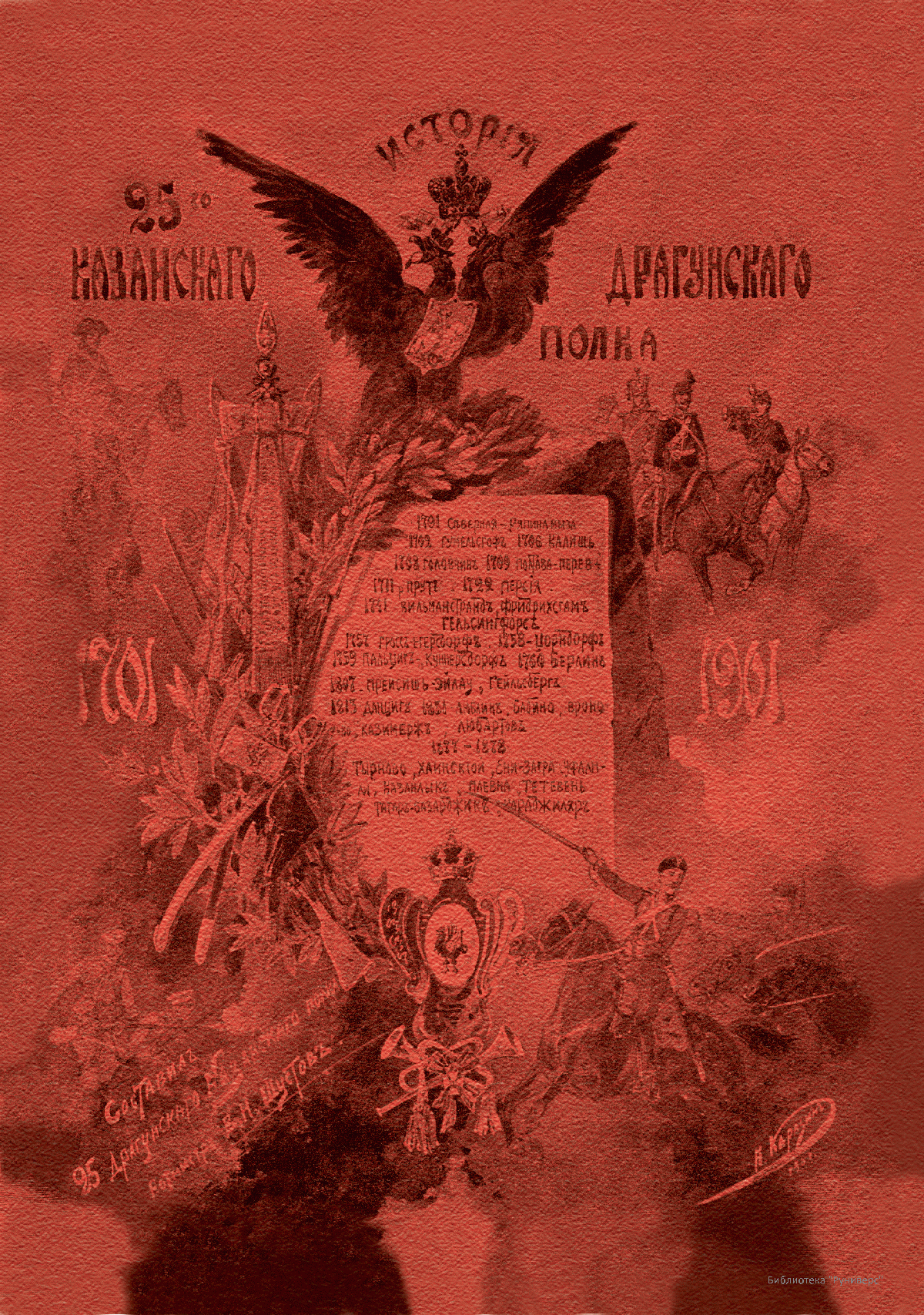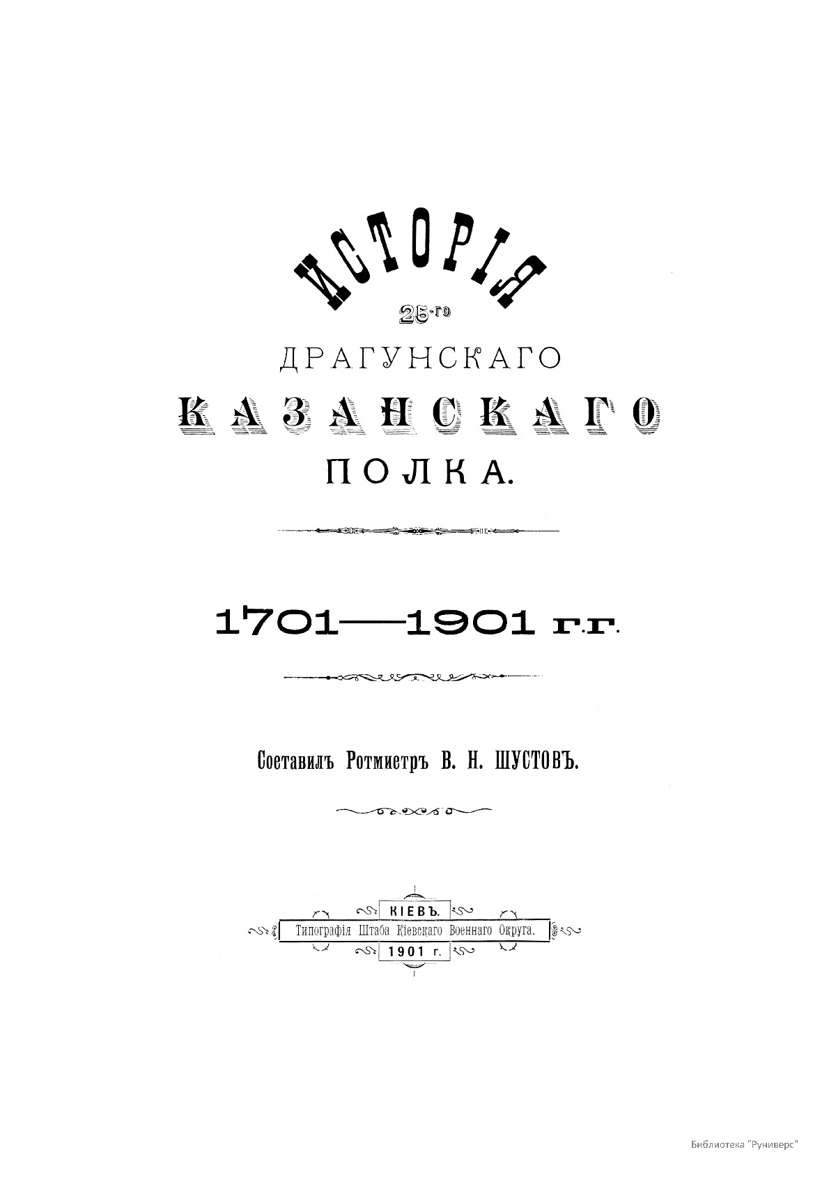 Книга ротмистра В. Н. Шустова «История 25-го драгунского Казанского полка. 1701–1901» вышла в Киеве в 1901 г. Издание было приурочено к 200-летнему юбилею полка. 25-й драгунский Казанский полк имеет древнюю и славную историю, являясь одним из старейших регулярных полков русской армии.