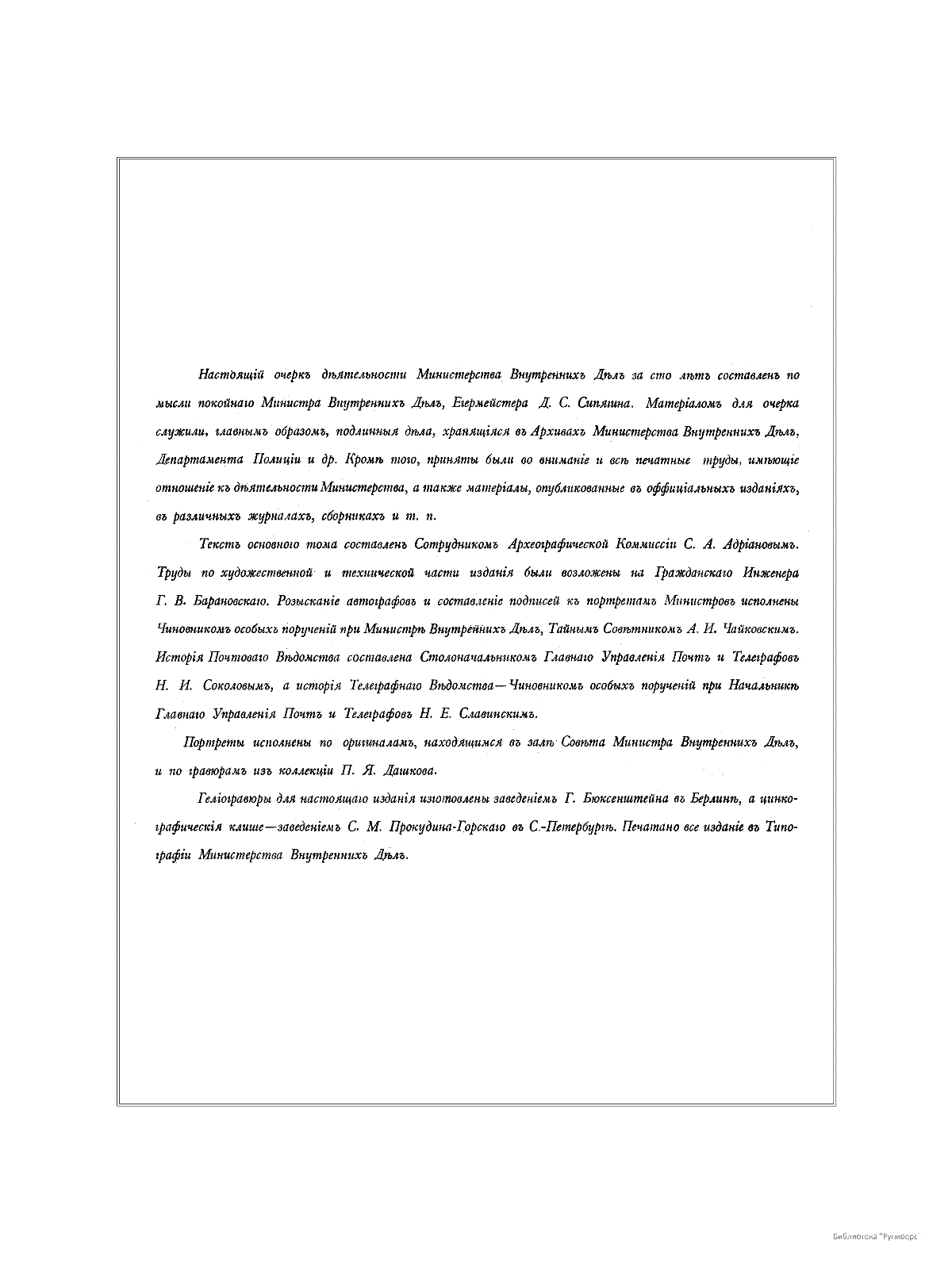 Настоящий очерк составлен по инициативе министра внутренних дел, егермейстера Д. С. Синягина. Материалом для очерка служили, главным образом, подлинные дела, хранящиеся в архивах Министерства внутренних дел, Департамента полиции и др. Кроме того, приняты были во внимание и все печатные труды, имеющие отношение к деятельности министерства, а также материалы, опубликованные в официальных журналах, сборниках и т. д. Портреты исполнены по оригиналам, находящимся в зале Совета министра внутренних дел, и по гравюрам из коллекции П. Я. Дашкова. Гелиогравюры для настоящего издания изготовлены заведением Г. Бюксенштейна в Берлине, а цинкографические клише — заведением С. М. Прокудина-Горского в Петербурге. Текст основного тома составлен сотрудником Археографической комиссии С. А. Адриановым. Труды по художественной и технической части издания были возложены на гражданского инженера Г. В. Барановского. Сбор автографов и составление подписей к портретам министров исполнены чиновником особых поручений при министре внутренних дел, тайным советником А. И. Чайковским. История Почтового ведомства составлена столоначальником Главного управления почт и телеграфов Н. И. Соколовым, а история Телеграфного ведомства — чиновником особых поручений при начальнике Главного управления почт и телеграфов Н. Е. Славинским.