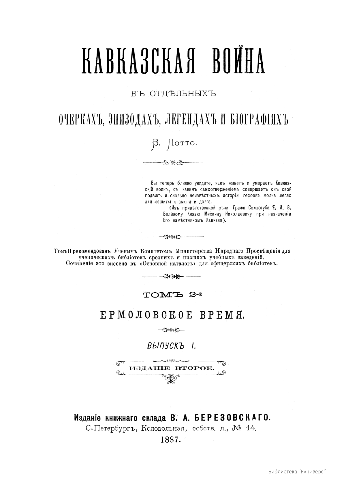 Кавказская война въ отдѣльныхъ очеркахъ, эпизодахъ, легендахъ и бiографияхъ. Томъ 2-й. Ермоловское время