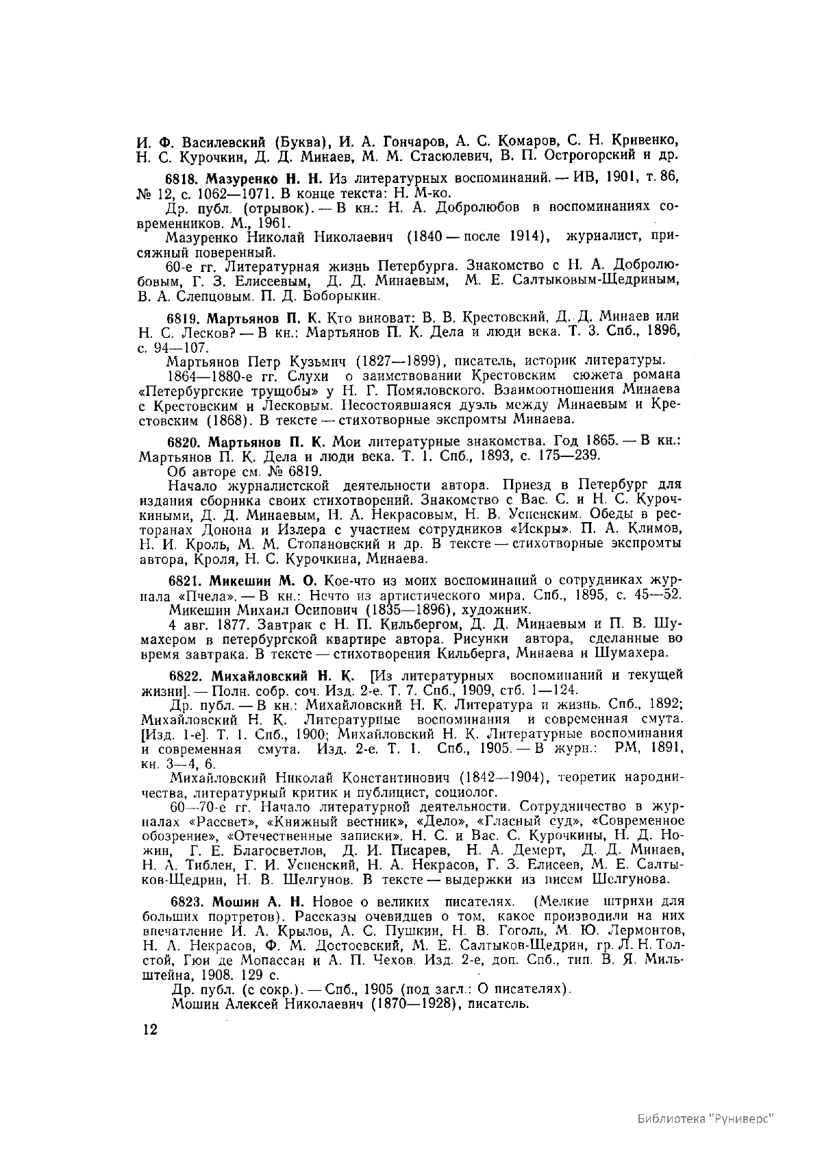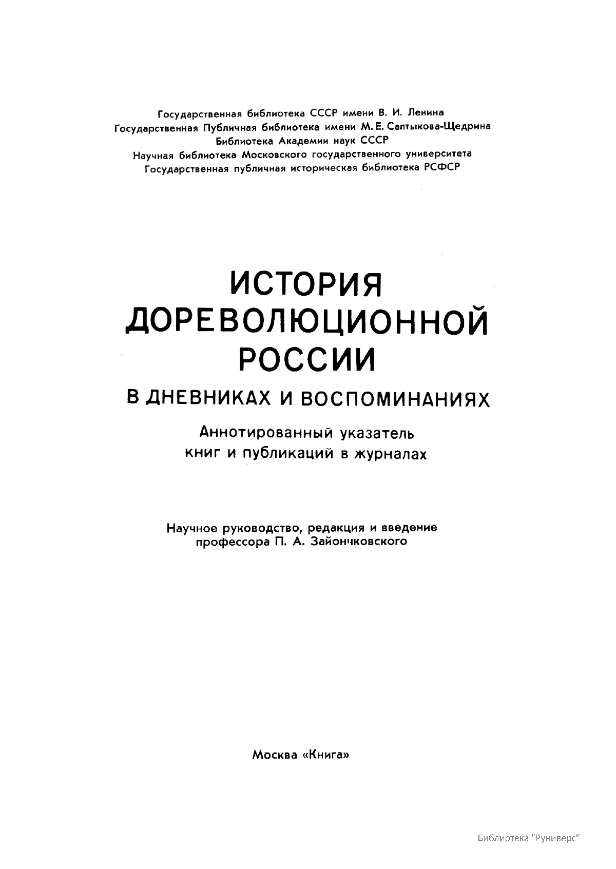 Многотомное издание этого уникального библиографического исследования, ставшего итогом многолетней работы большого коллектива ведущих отечественных источниковедов и библиографов главных библиотек нашей страны, представляет собой крупнейшее собрание аннотированной мемуарной литературы по истории России. Ведущую роль в создании этого фундаментального издания сыграл крупный отечественный ученый-историк П.А. Зайончковский, под редакцией и неусыпным контролем которого разрабатывался и выходил представленный многотомник (последние 5 книг вышли после кончины этого замечательного учёного-энциклопедиста).