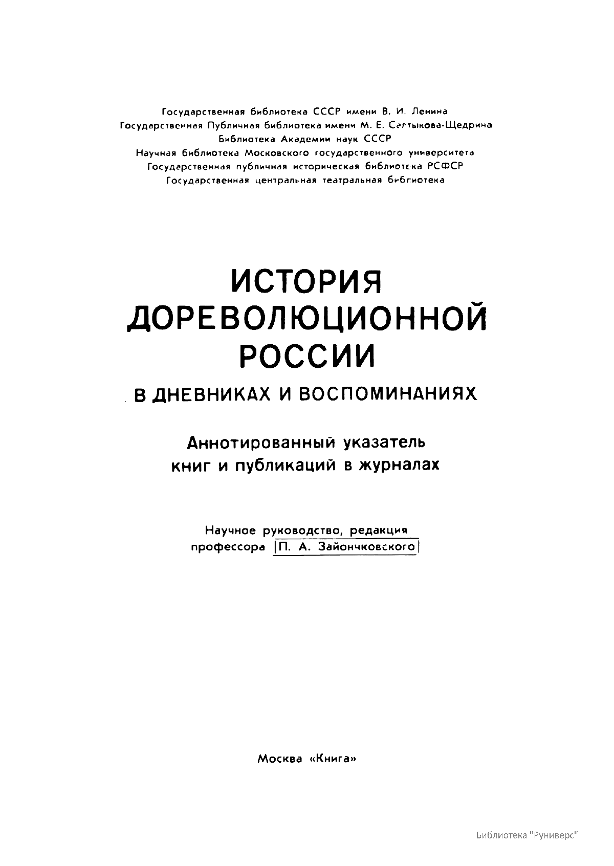 Многотомное издание этого уникального библиографического исследования, ставшего итогом многолетней работы большого коллектива ведущих отечественных источниковедов и библиографов главных библиотек нашей страны, представляет собой крупнейшее собрание аннотированной мемуарной литературы по истории России. Ведущую роль в создании этого фундаментального издания сыграл крупный отечественный ученый-историк П.А. Зайончковский, под редакцией и неусыпным контролем которого разрабатывался и выходил представленный многотомник (последние 5 книг вышли после кончины этого замечательного учёного-энциклопедиста).