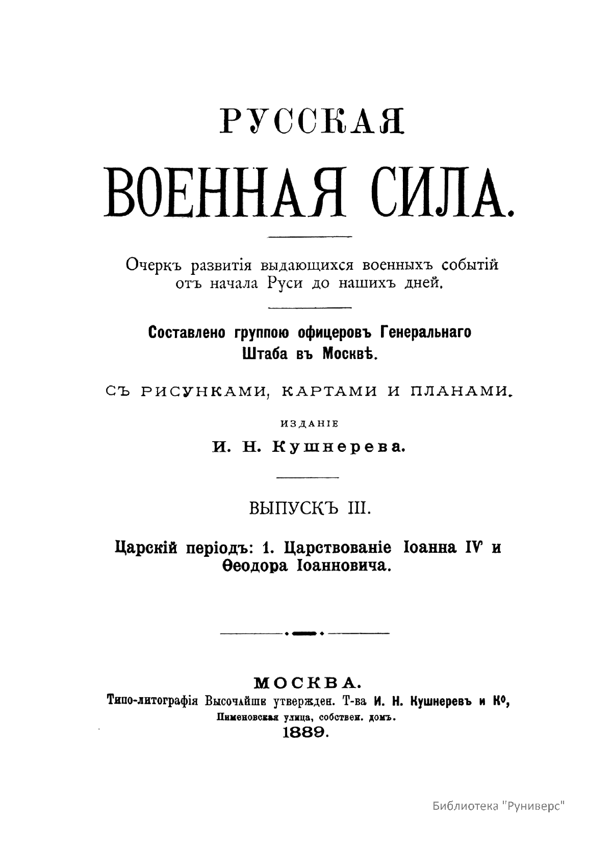 «Русская военная сила» (Очерк развития выдающихся военных событий от начала Руси до наших дней), составленная обществом офицеров Генерального штаба в Москве, начала публиковаться с 1888 г. «Русская военная сила» по праву считалась одним из лучших сводных общедоступных исследований по российской военной истории.