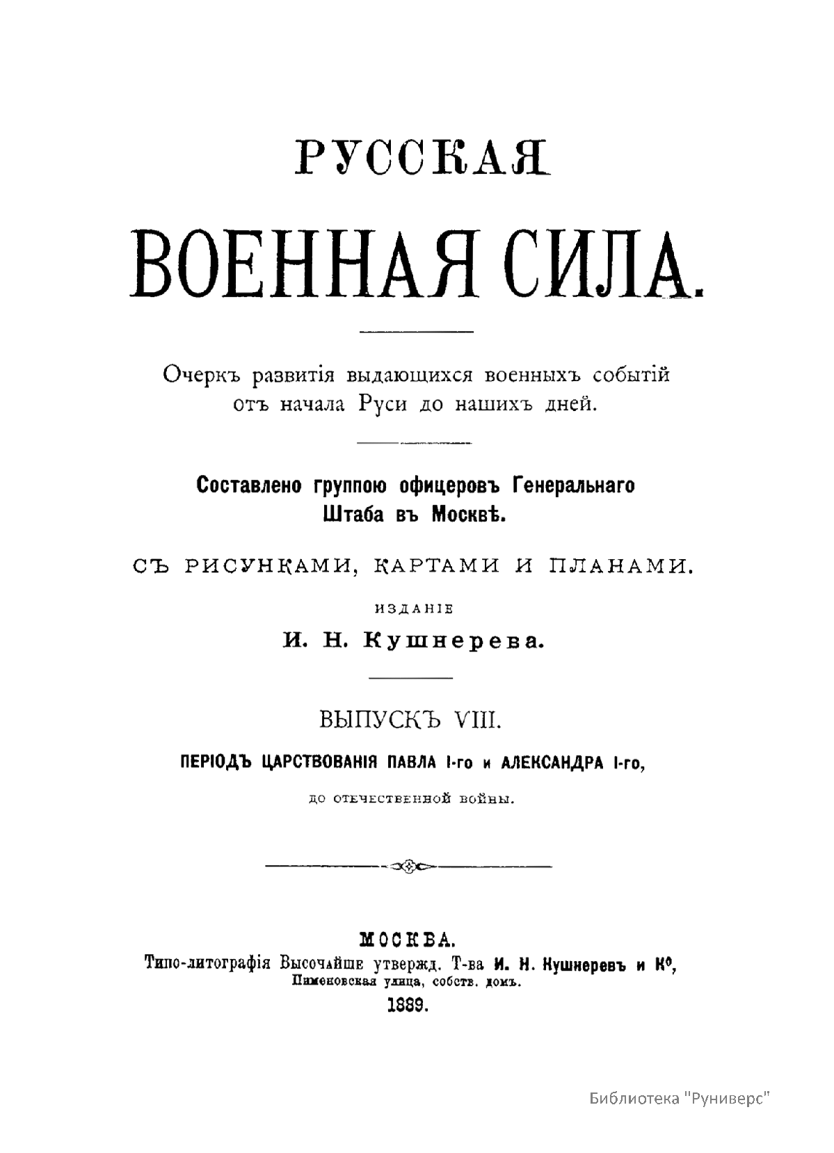 «Русская военная сила» (Очерк развития выдающихся военных событий от начала Руси до наших дней), составленная обществом офицеров Генерального штаба в Москве, начала публиковаться с 1888 г. «Русская военная сила» по праву считалась одним из лучших сводных общедоступных исследований по российской военной истории.