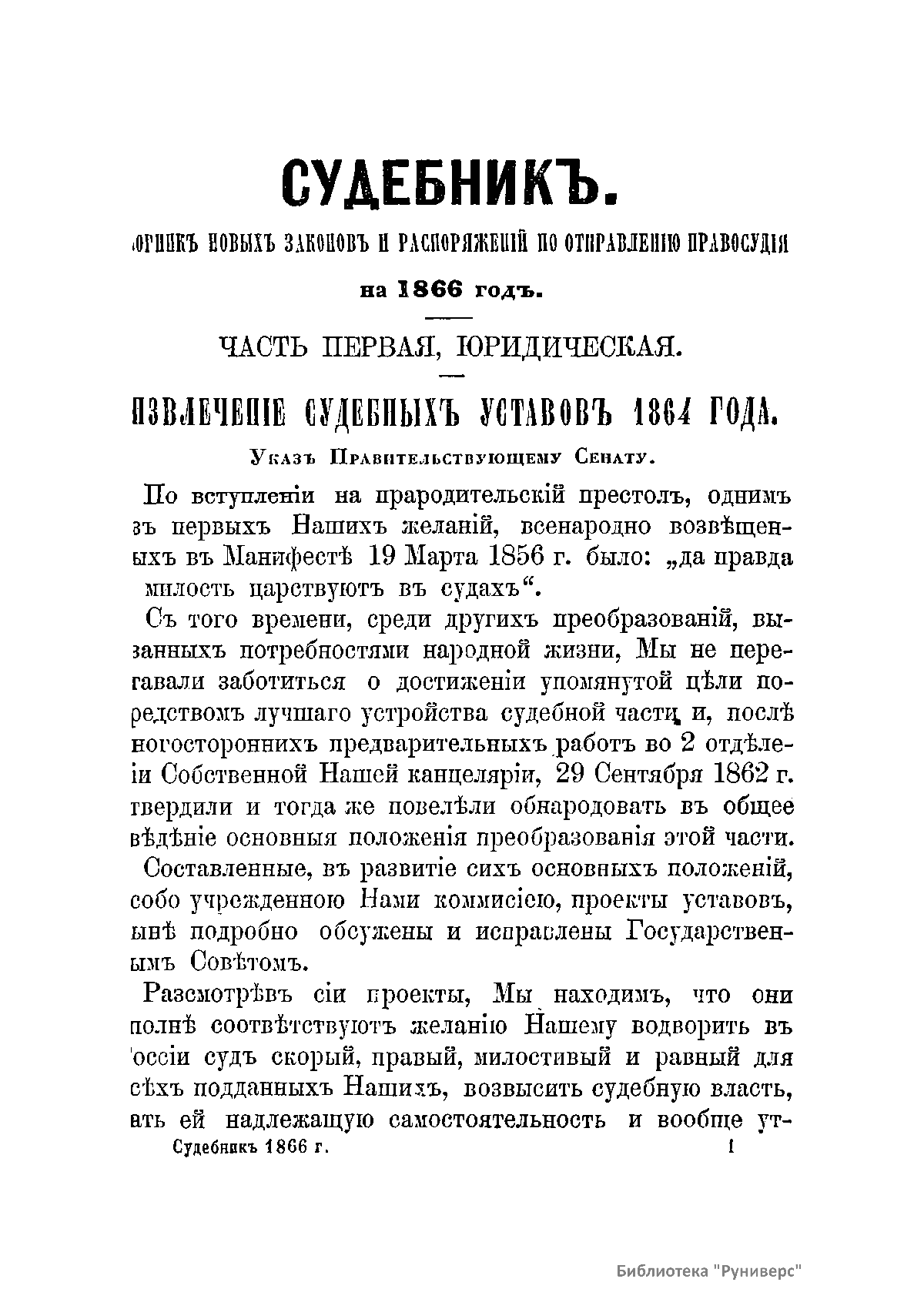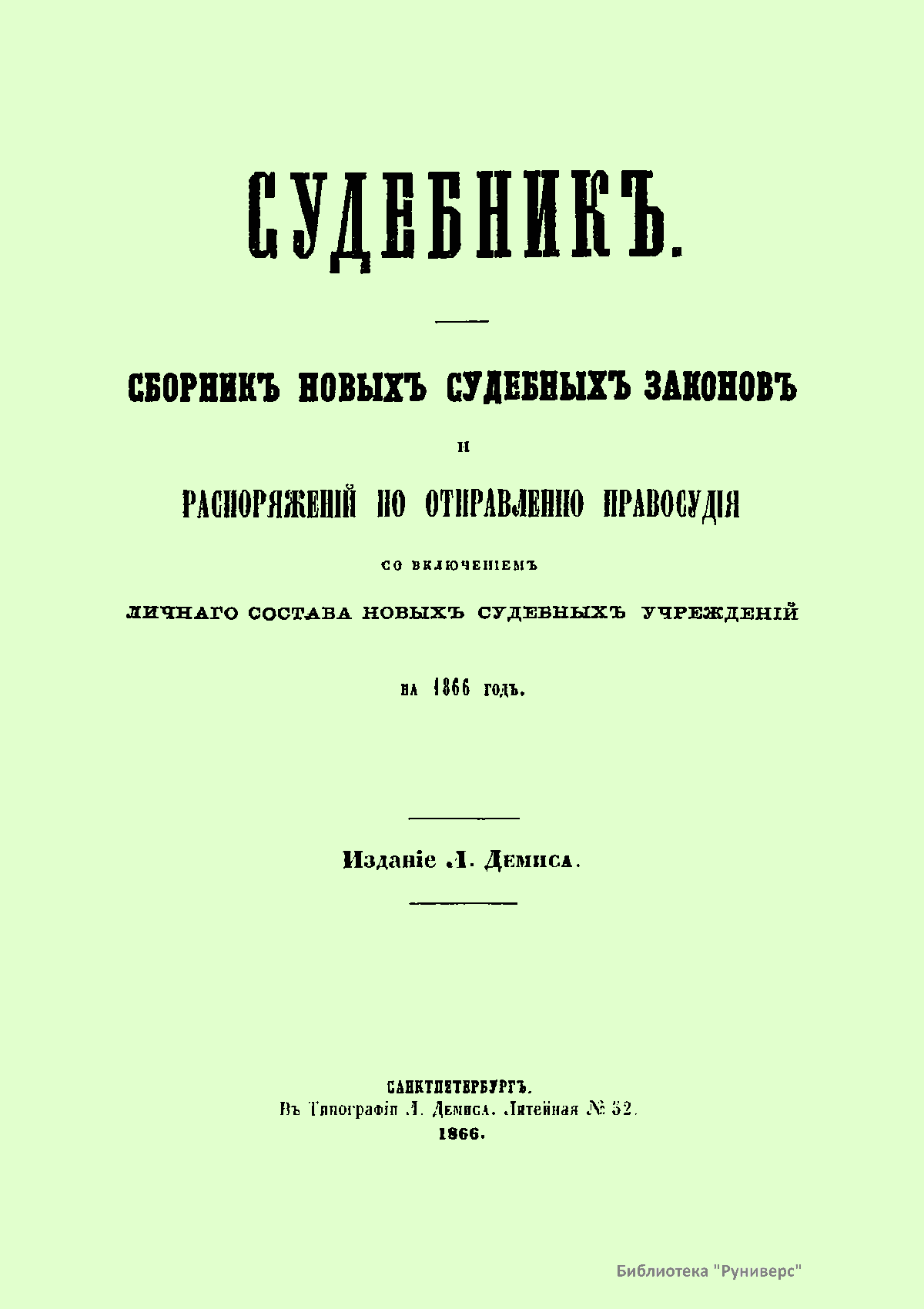 Судебникъ. Сборникъ новыхъ судебныхъ законовъ и распоряженiй по отправлению правосудiя со включенiемъ личнаго состава новыхъ судебныхъ учрежденiй на 1866 годъ