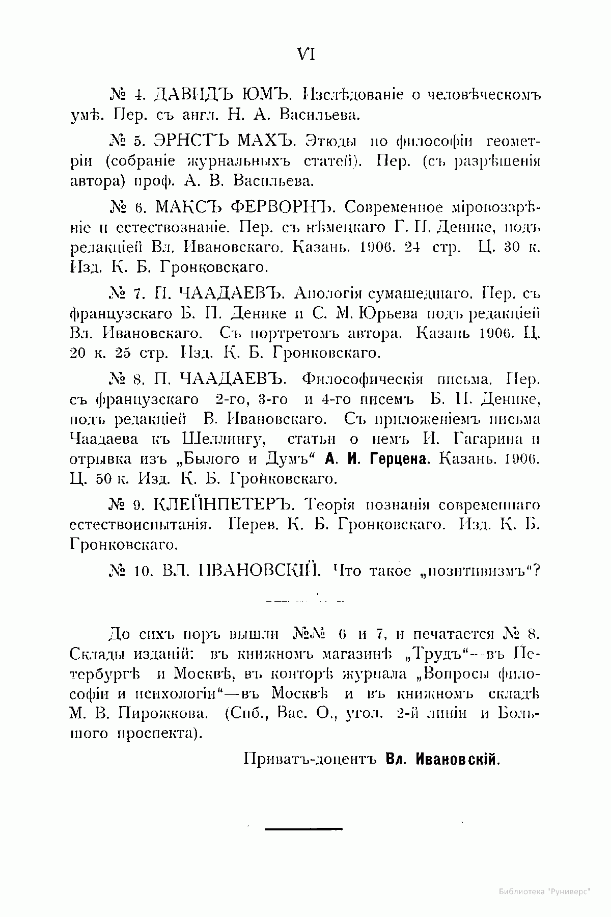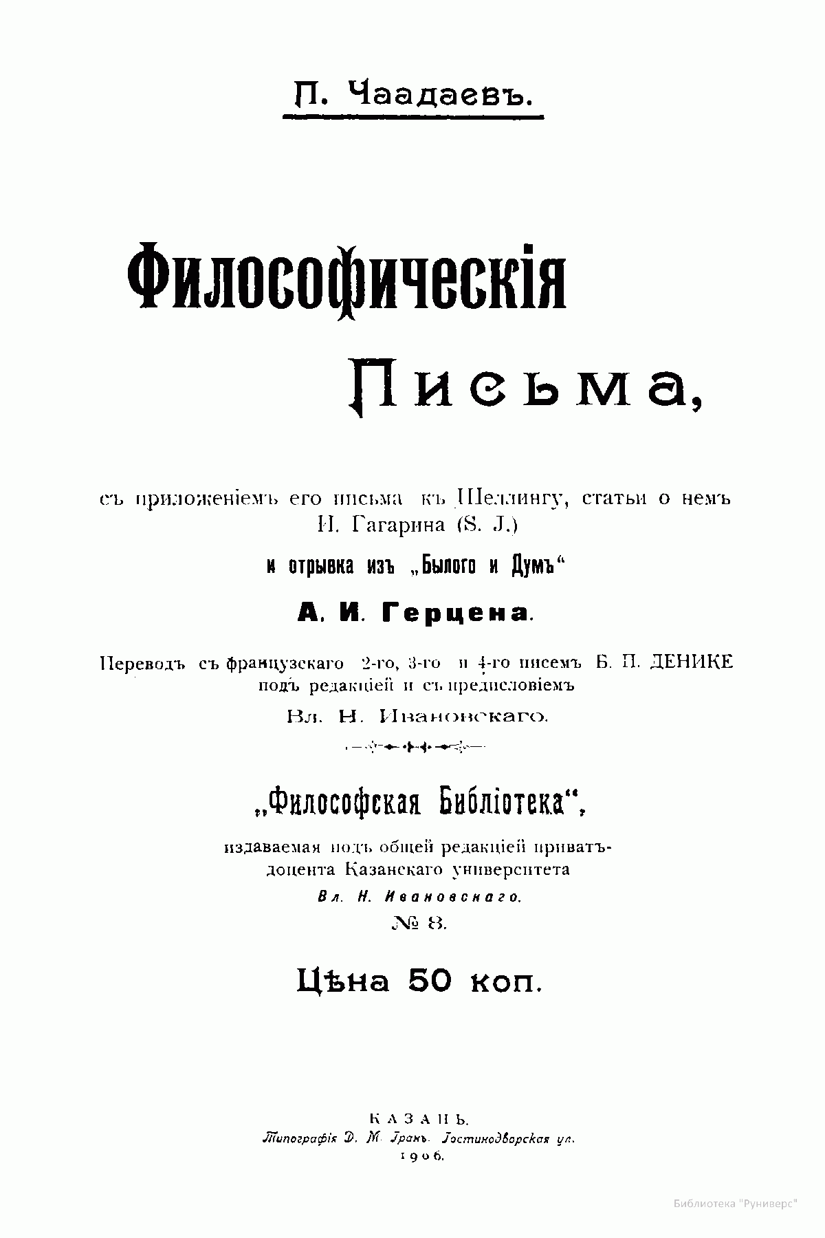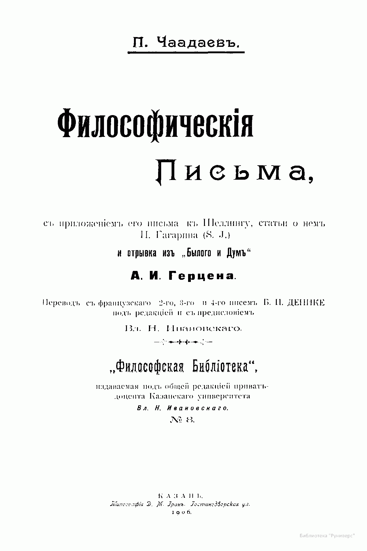 Также следует отметить, что Казанское издание "Философических писем" П.Чаадаева (и его "Апологии сумасшедшего"), вышедшее в 1906 г. под редакцией и с предисловием приват-доцента Казанского университета