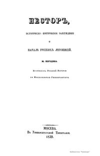 Несторъ, историческо-критическое разсужденiе о началѣ русскихъ лѣтописей
