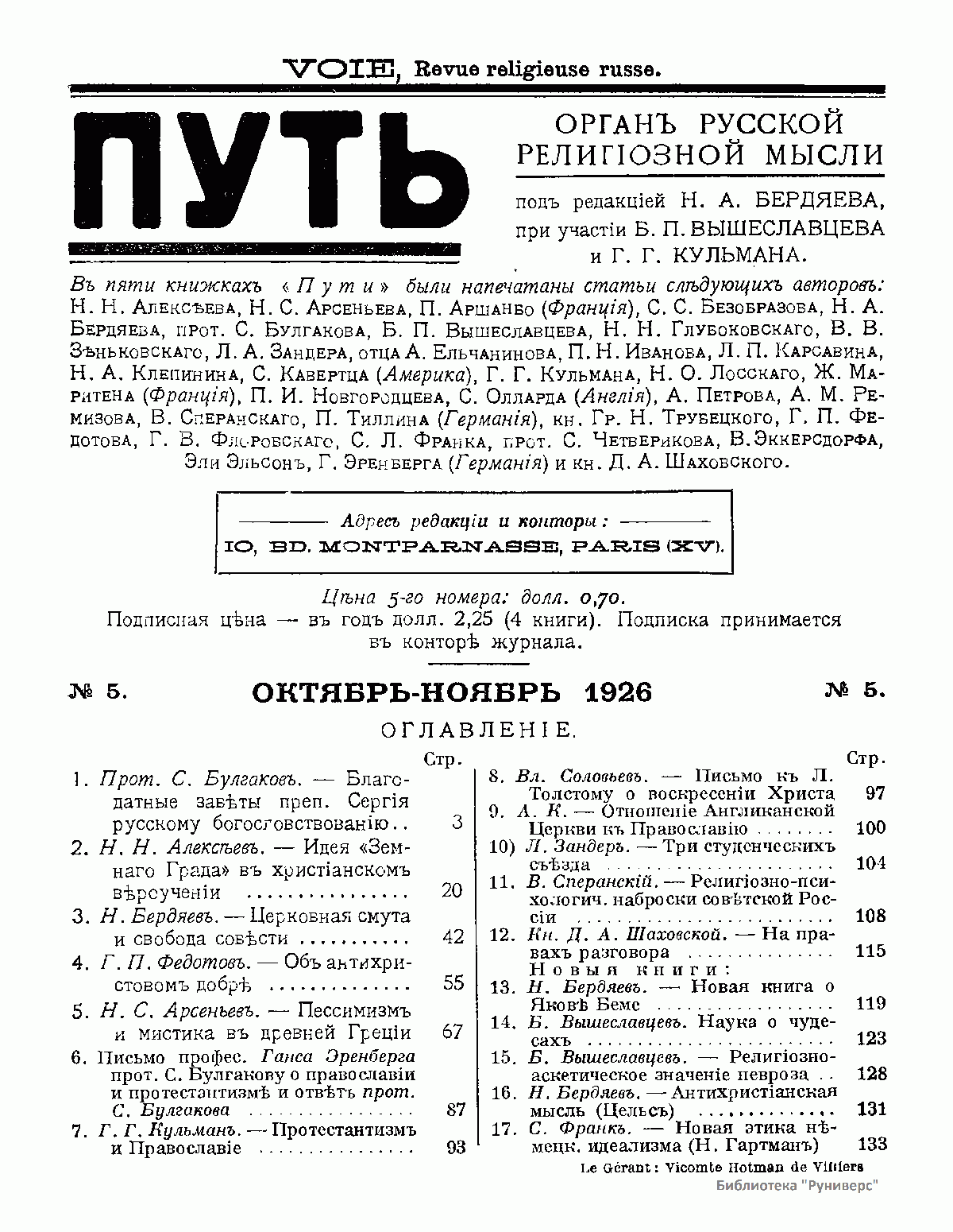 (1877- 1950) и др. В дальнейшем состав сотрудников менялся, привлекались также немецкие и английские корреспонденты (Ж. Маритен, П. Тиллих, С. Оллард и др.). Всего с журналом за 15 лет его существования сотрудничали около 130 человек. Журнал насчитывал 61 выпуск при тираже 1000–1200 экземпляров. По своему формату это было интеллектуальное богословско-философское периодическое издание, включающее наряду с академическими статьями, публицистику, эссе, письма, мемуары.