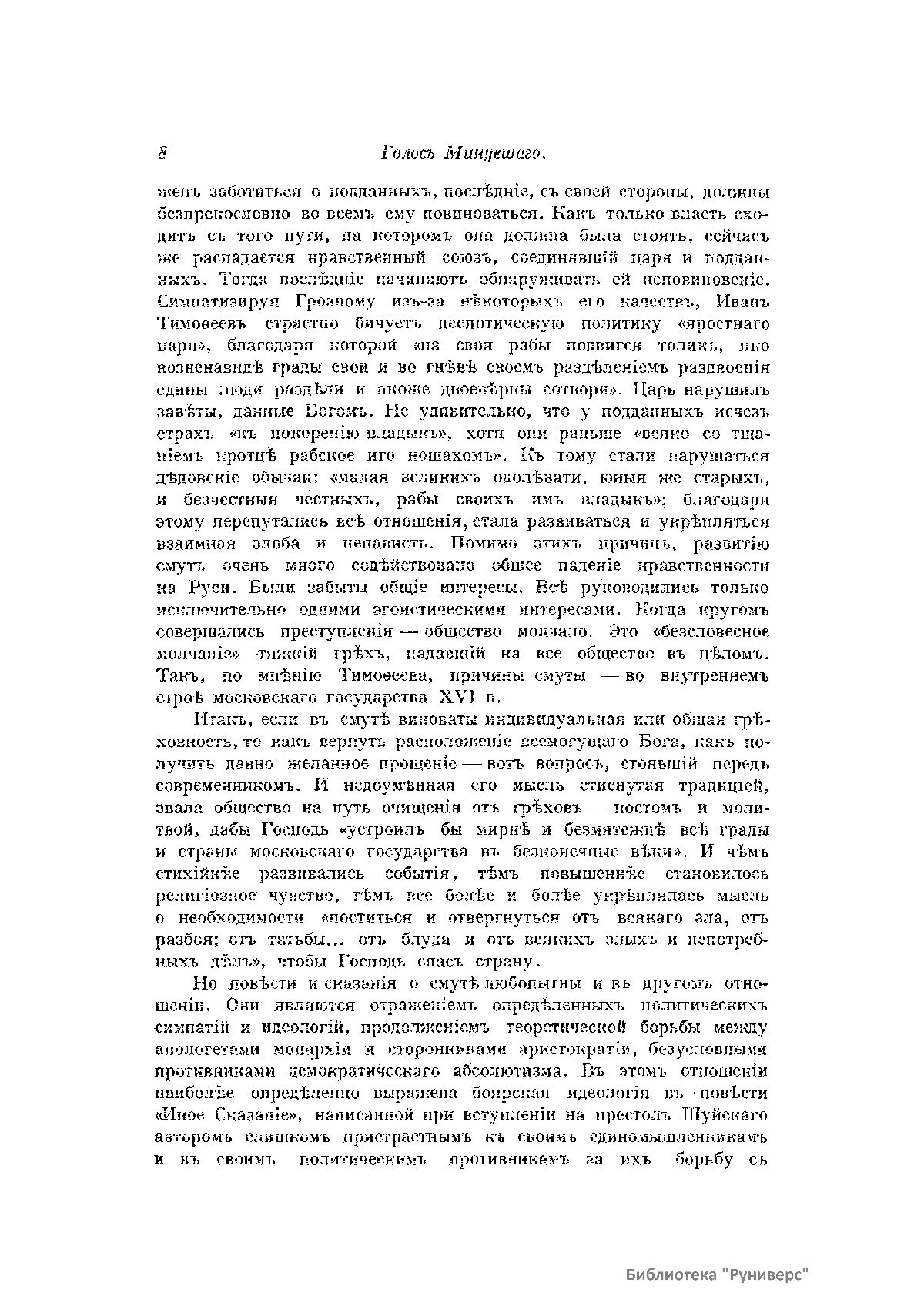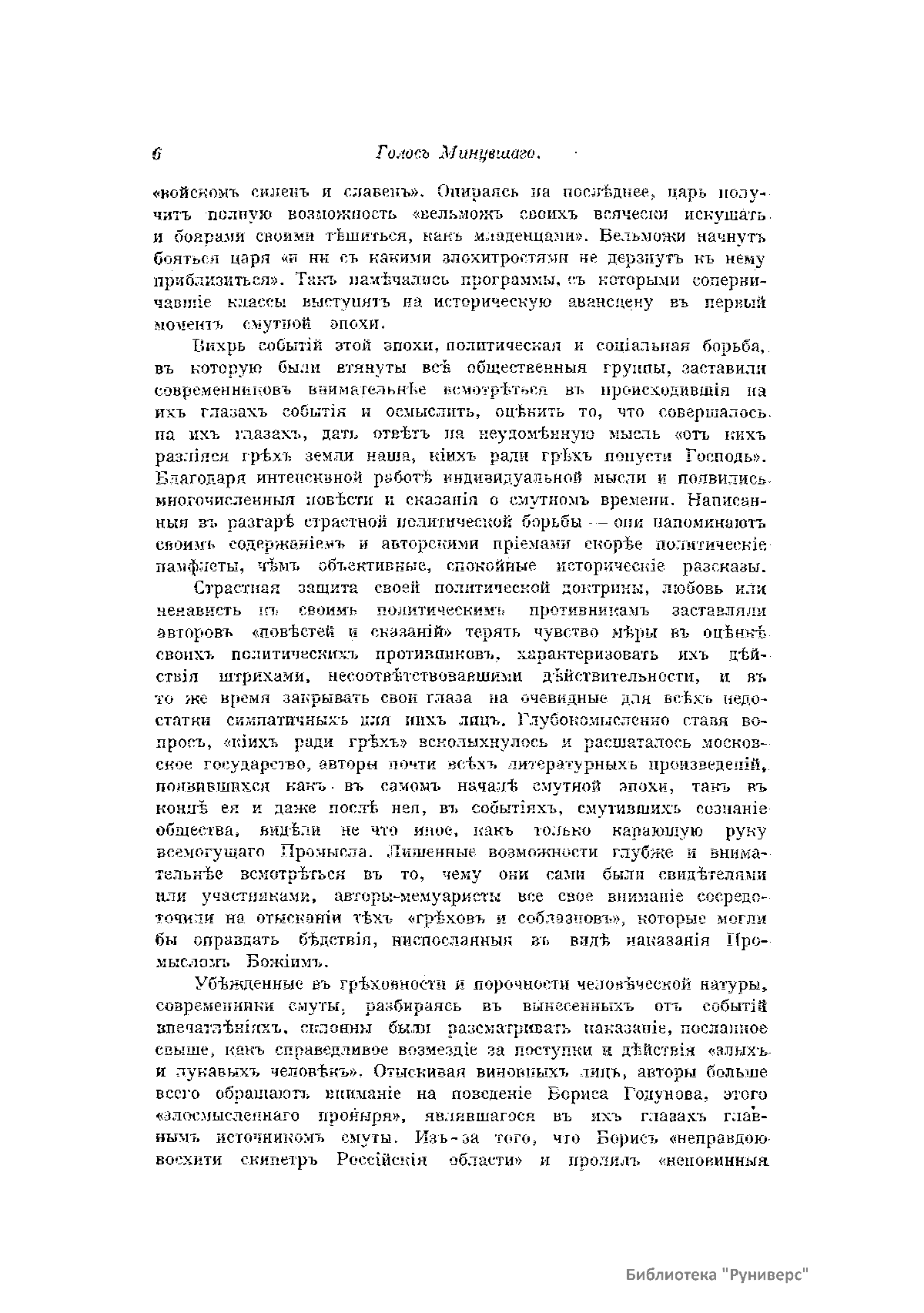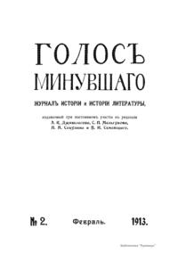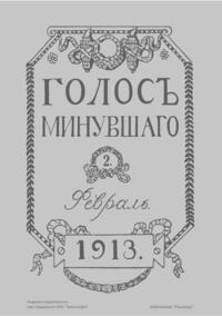 «Голос Минувшего» — журнал истории и истории литературы либерально-народнического направления, издававшийся в Москве с 1913 по 1923 год. Издателем журнала в 1913–1922 годах были известные русские историки, публицисты и общественные деятели С. П. Мельгунов (1880–1956) и В. И. Семевский (1848–1916). В редакционную коллегию также входили А. К. Дживелегов и П. Н. Сакулин. До 1919 «Голос минувшего» выходил ежемесячно, затем нерегулярно, всего было выпущено 65 номеров. В журнале публиковались интереснейшие материалы, посвященные истории литературы и общественных движений в России второй половины XVIII – начала XX веков. Здесь можно найти: статьи по вопросам русской и всеобщей истории, истории литературы, философии, искусства и археологии. В издании представлены: историческая беллетристика, биографии русских и иностранных деятелей, критика и библиография, новости русской и иностранной науки, обзор журналов русских и иностранных, хроника, мемуары, записки, дневники и письма декабристов, видных народовольцев и эсеров, крупных общественных деятелей и царских администраторов, писателей, военачальников и др. Среди авторов: Е. В. Тарле, А. Ф. Кони, А. К. Дживелегов, А. А. Кизеветтер, В. Г. Короленко и др. Стремление сделать журнал интересным для более широкого круга читателей способствовало тому, что в «Голосе Минувшего», хоть и в ограниченном количестве, печатались статьи по истории искусства и помещались иллюстрации: портреты, картины и рисунки, не знакомые или мало знакомые публике. В журнале опубликован целый ряд интересных писем, документов и воспоминаний. Абсолютное большинство текстов никогда не переиздавалось. Журнал снабжен указателями имен за 1913–1922 годы и систематическим указателем содержания.