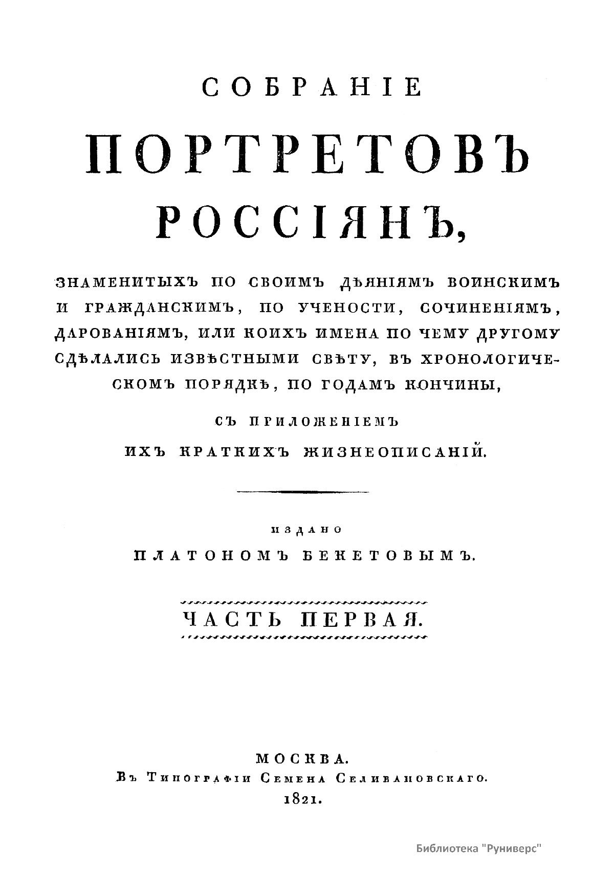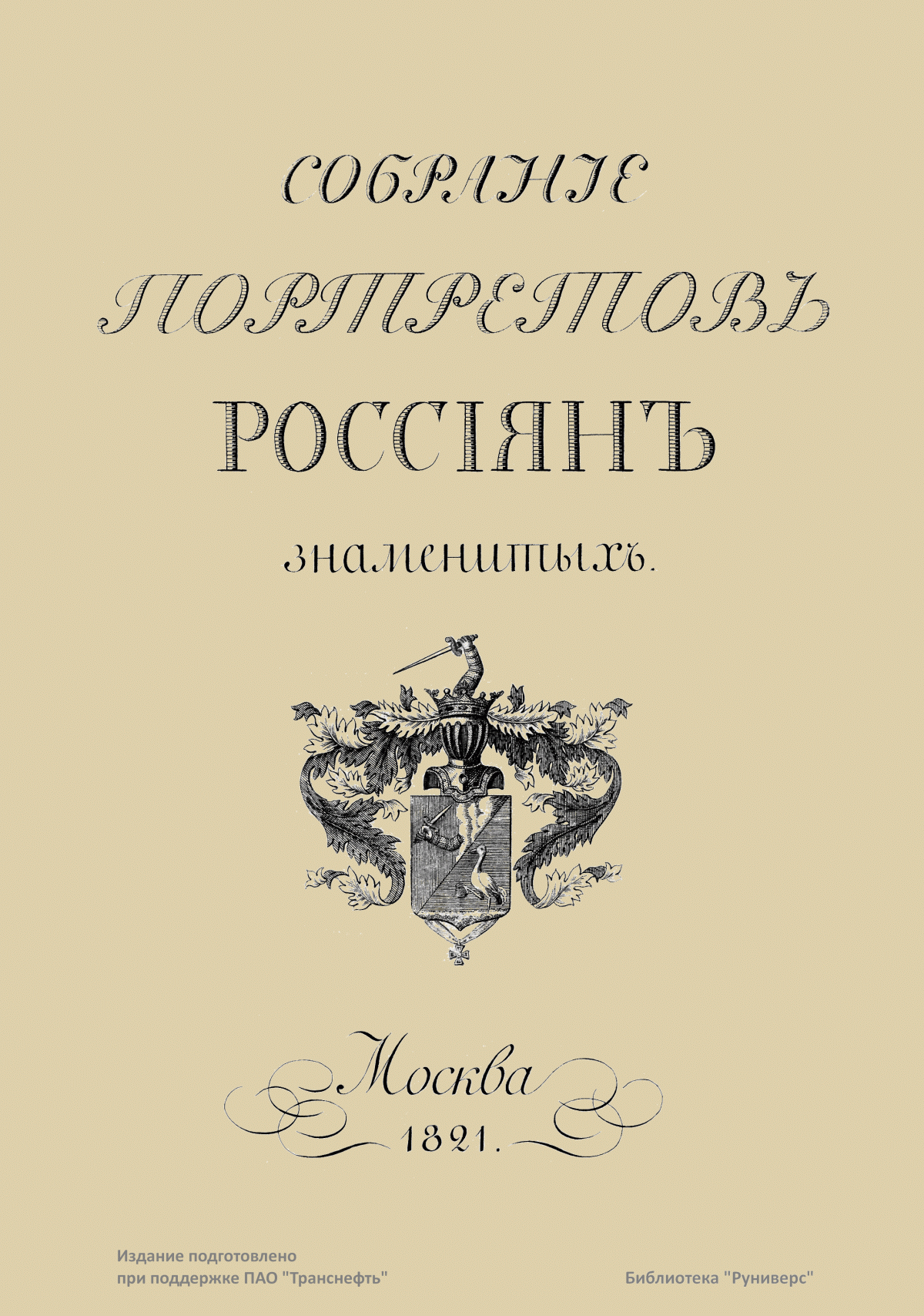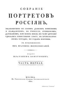 Собранiе портретовъ россiянъ, знаменитыхъ по своимъ дѣяниямъ воинскимъ и гражданскимъ, по учености, сочиненiямъ, дарованiямъ, или коихъ имена по чему другому сдѣлались извѣстными свѣту, въ хронологическомъ порядкѣ, по годамъ кончины, съ приложенiемъ ихъ краткихъ жизнеописанiй