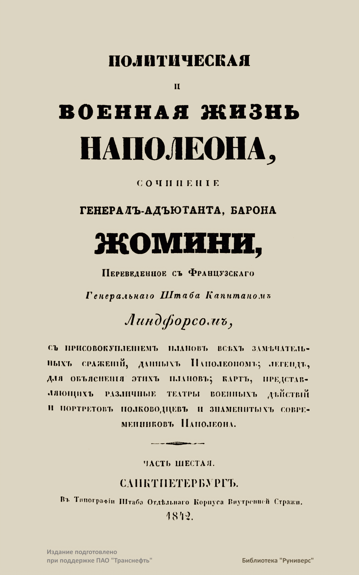 Русский перевод сочинения «Политическая и военная жизнь Наполеона» был сделан со знаменитой работы Жомини, изданной в Париже в 1827 г., — «Vie politique et militaire de Napoléon, racontée par lui-même au tribunal de César, d’Alexandre et de Frédéric» («Политическая и военная жизнь Наполеона, рассказанная им перед судом Цезаря, Александра и Фридриха»). Для данного труда Жомини избрал форму рассказа, который Наполеон ведет о своих походах. В основу этого повествования от первого лица лег, без сомнения, труд Э. О. де Лас Каза — секретаря Наполеона, записывавшего его мысли и воспоминания на острове Св. Елены, изданный в 1822–1823 гг. под названием «Mémorial de Sainte-Hélène» («Мемориал Святой Елены).