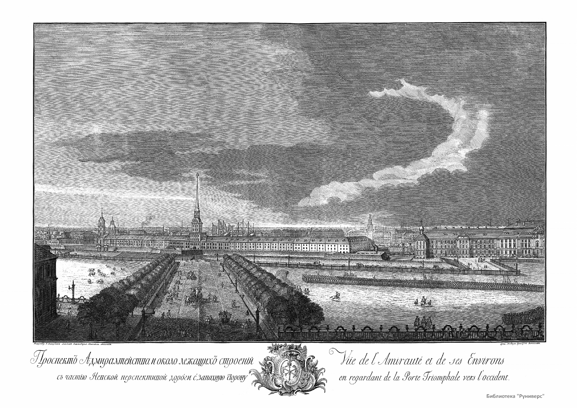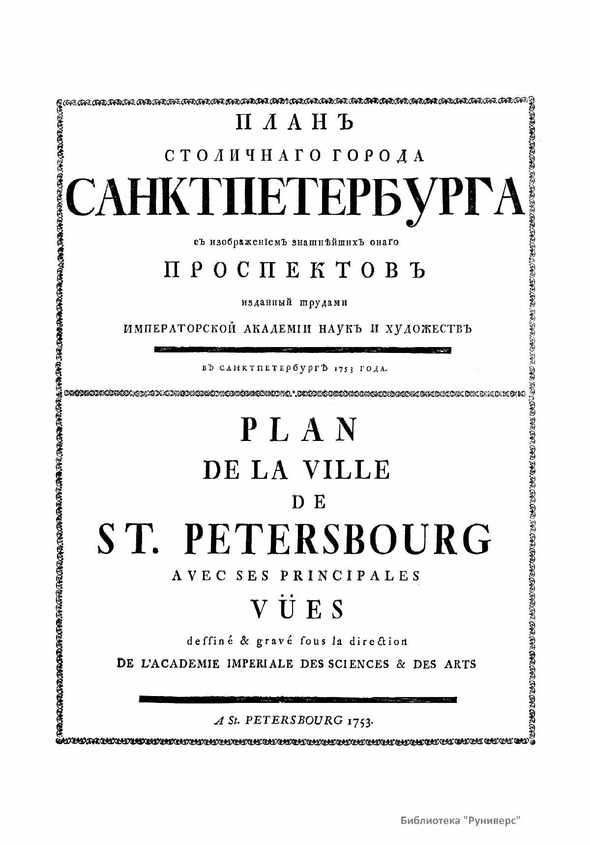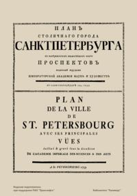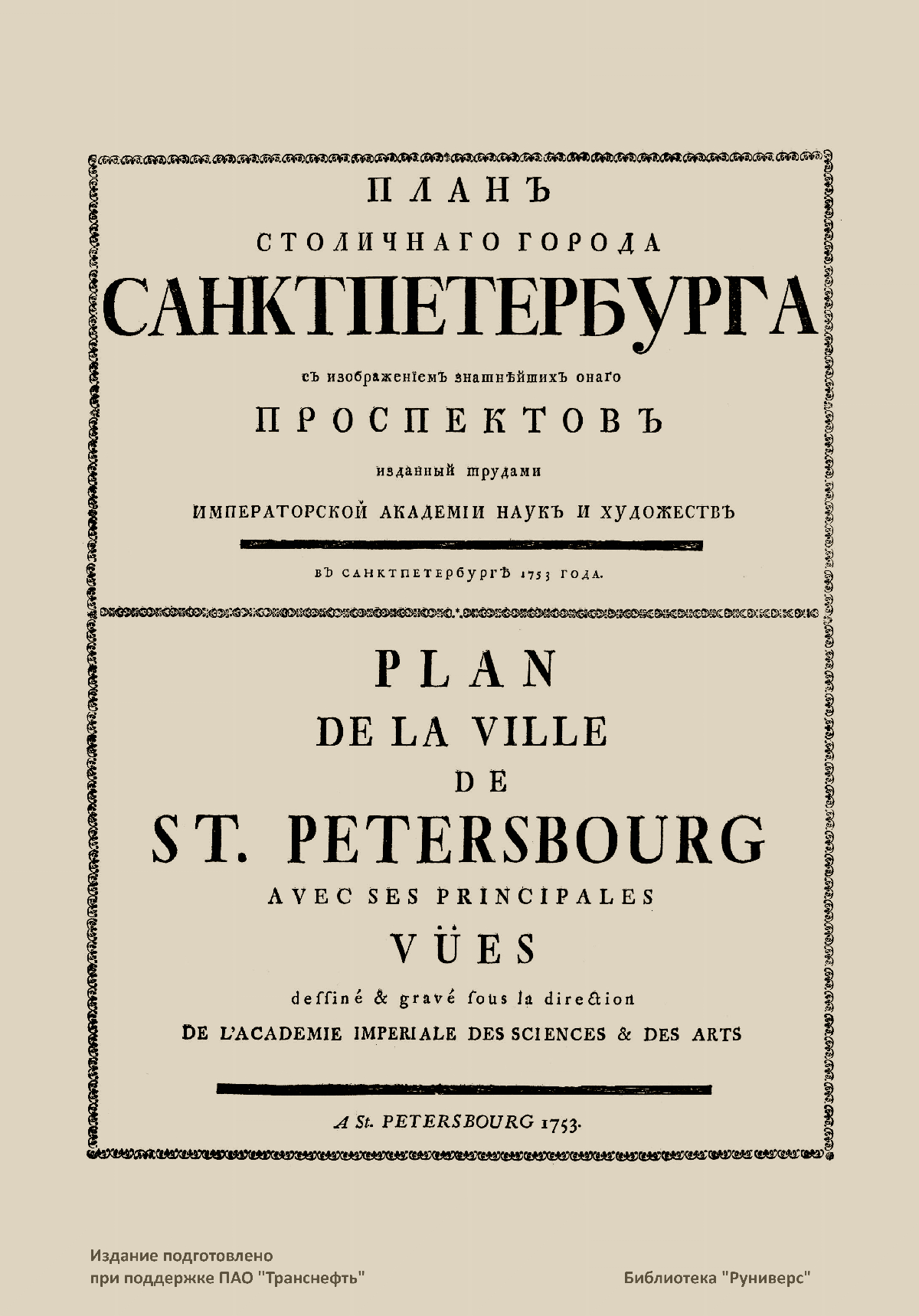Для управления «художествами» в Академии наук и художеств в мае 1748 г. образовалось Совещание по делам художественным. На одном из первых заседаний Совещание приняло решение о составлении плана столицы «для славы и чести Российской империи». План размером 132,5х197 см был изготовлен в 1748–1749 гг. под руководством адъюнкта И. Ф. Трускотта и гравирован на девяти медных досках лучшими мастерами Гравировальной палаты. Предполагалось, что план будут обрамлять 12 «знатнейших проспектов» размерами от 41х66 см до 41х132 см; проспекты были созданы М. И. Махаевым, но не в качестве обрамления. В приложении к предлагаемому читателю альбому издательство реализовало этот неосуществленный замысел. План Трускотта — первый подробный план Петербурга, важнейшие здания изображены в аксонометрии, подписаны и замаркированы. К плану приложена «Роспись сторонам, островам, рекам…», повышающая его информативность. Размеры плана позволяют многое рассмотреть, увидеть давно исчезнувшее, уточнить наши знания о пятидесятилетнем Петербурге. «Проспекты» Махаева ценны не только качеством воспроизведения, но и размерами, позволяющими разглядеть то, что пожелал запечатлеть художник. Альбом сопровождают вступительная статья крупнейшего знатока русской гравюры XVIII в. М. А. Алексеевой и комментарии к проспектам автора книг о Петербурге Ф. М. Лурье.