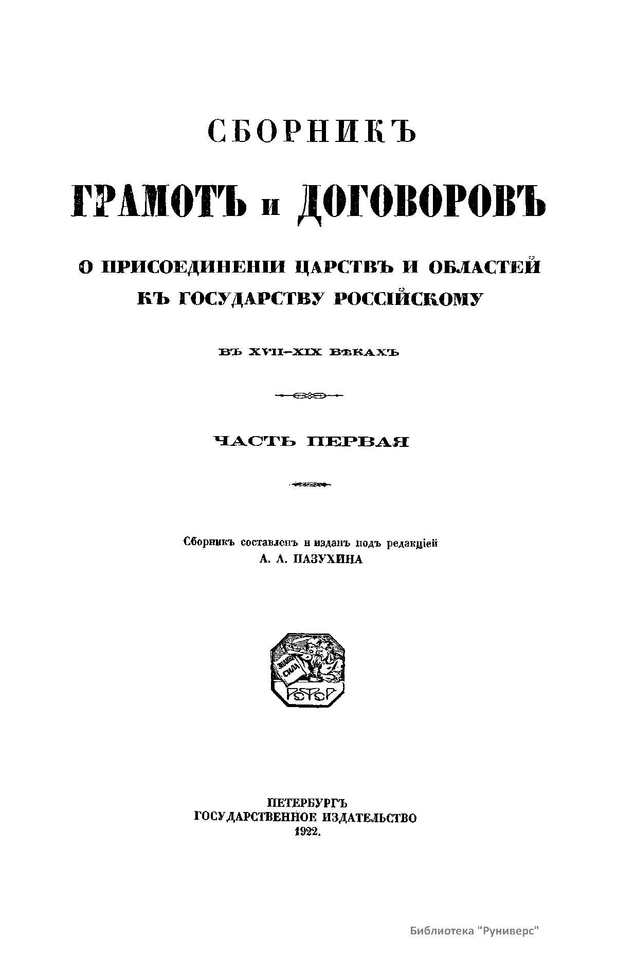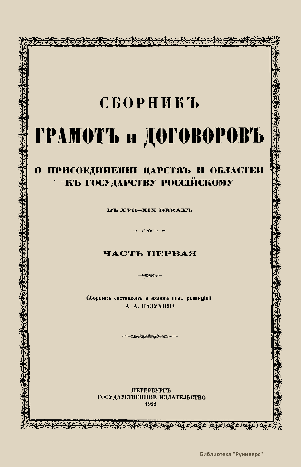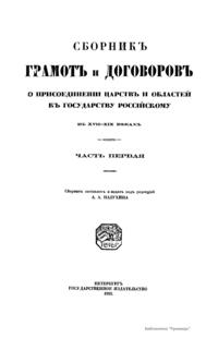 Сборникъ грамотъ и договоровъ о присоединенiи царствъ и областей къ государству россiйскому въ XVII-XIX вѣкахъ. Часть первая