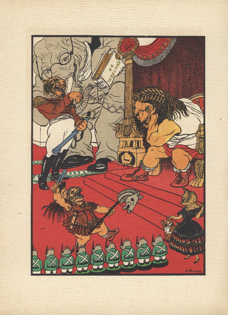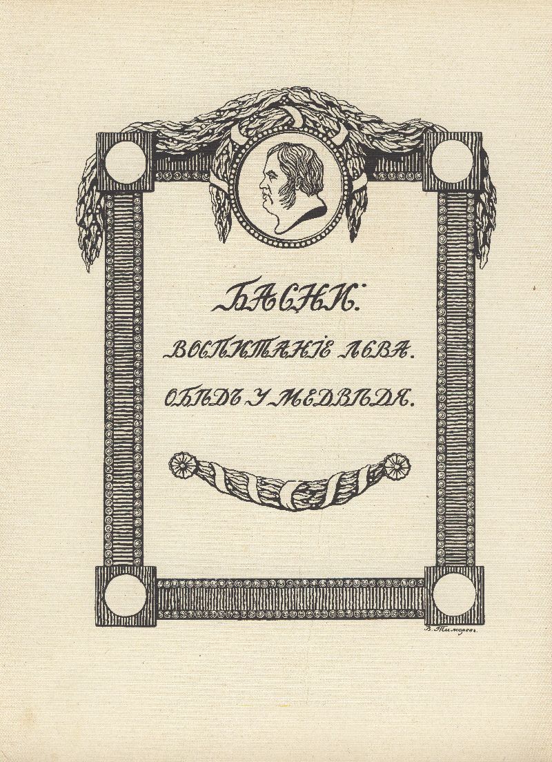 Возможно, Кнебель хотел привлечь к иллюстрированию басен различных художников. Так, например, издание 1912 года иллюстрирует Егор Нарбут. Серия оформлена в стилистике классицизма – своеобразная дань Крылову и его эпохе. Иллюстрации Тиморева на первый взгляд могут показаться не особо изящными. Они выполнены яркими красками против черно-белых точеных силуэтов Нарбута и написаны слишком натуралистично. Такие иллюстрации не соответствуют художественной эстетике начала ХХ века, но, возможно, именно такова и была задумка Кнебеля и Тиморева – изобразить героев басен в классицистическом стиле.
