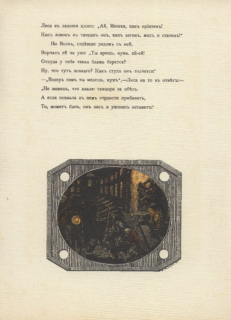 Многие рисунки вставлены в специальные рамки, которые призваны подчеркнуть эстетику ушедшей эпохи ампира, в которую жил и творил автор басен. Яркие цветные иллюстрации с «очеловеченными» персонажами мира зверей были намного более воспринимаемы детьми, чем отстраненная, «взрослая» графика Нарбута.