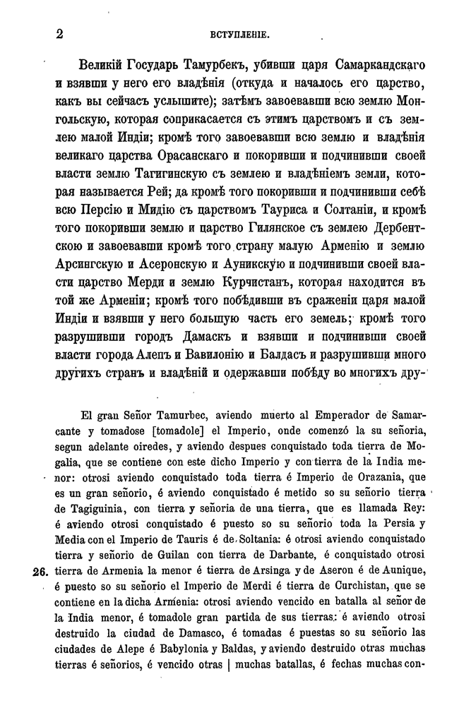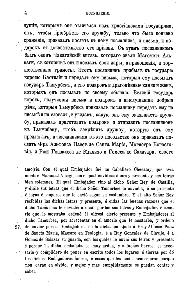 Сочинение Руи де Клавихо — своеобразный памятник испанской прозы: путевые заметки, написанные в форме дневника испанским послом, отправленным во главе ответного посольства в столицу Тимура Самарканд. Это произведение интересно не только как документ, в котором отмечаются глазами европейца факты и события начала XV в. на Востоке, но и как своего рода историческая энциклопедия. Труд Клавихо был создан примерно за полвека до начала испанского книгопечатания, а его издание было осуществлено только через полтора столетия, в пору наивысшего могущества Испании, когда уже были завоеваны Мексика, Перу, когда испанский конкистадор Васко Нуньес Бальбоа через панамский перешеек проник в Южную Америку, когда влияние Испании безраздельно господствовало в Европе. Издание сочинения Клавихо было призвано как бы иллюстрировать дальновидную политику испанских королей, еще в самом начале XV в. осуществивших захват Канарских островов (1402 г.), который стал прологом открытий в Новом Свете, и направлявших посольства на Восток — в Малую Азию и даже в Самарканд.