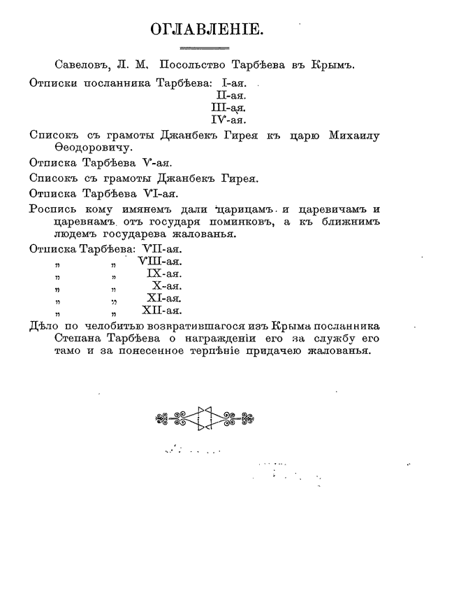 Труд Л. М. Савелова содержит отписки и челобитные в посольский приказ посланника С.И. Тарабаева и ездивших с ним дворян – Петра Ивановича Савелова и др.