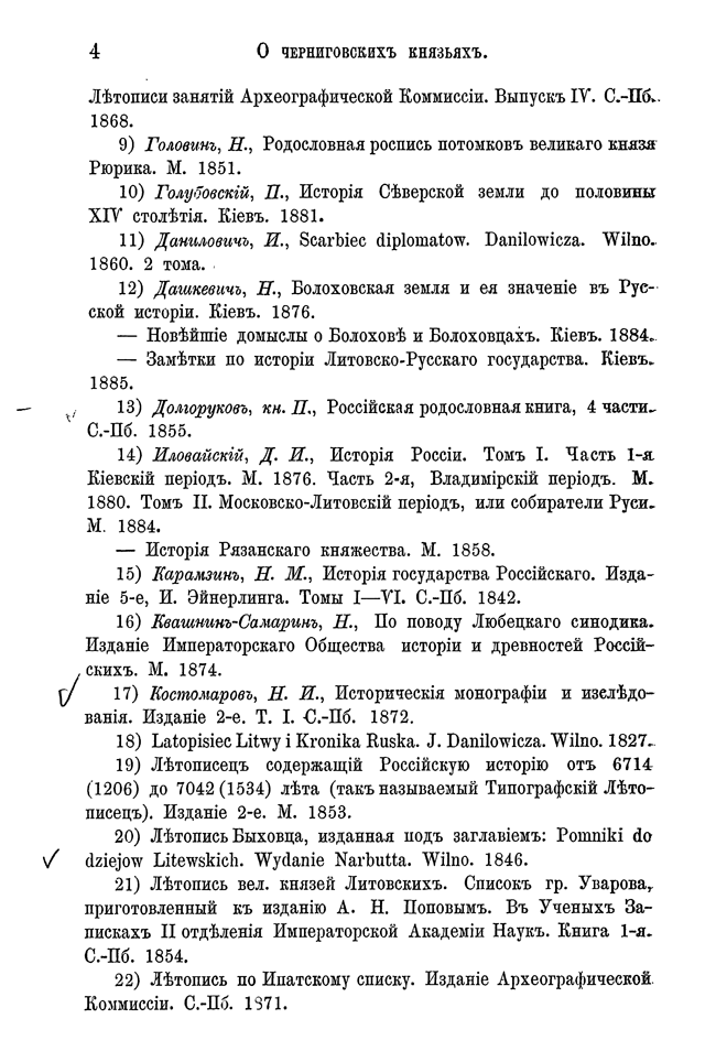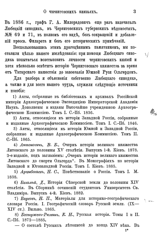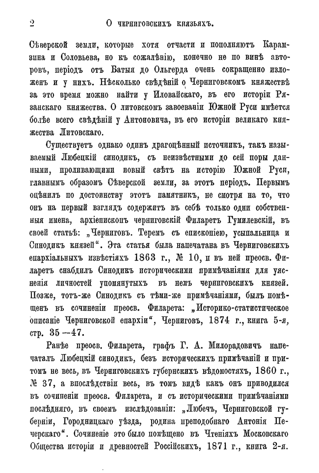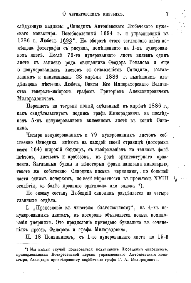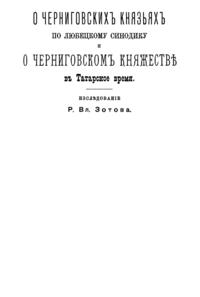 Автор, используя любецкий поминальный синодик, содержащий имена черниговских князей, попытался восстановить в отдельных деталях историю Черниговского княжества в период ига. Он откомментировал имена персон, упомянутых в синодике и сопоставил сведения о них с материалами, собранными Археографической комиссией.