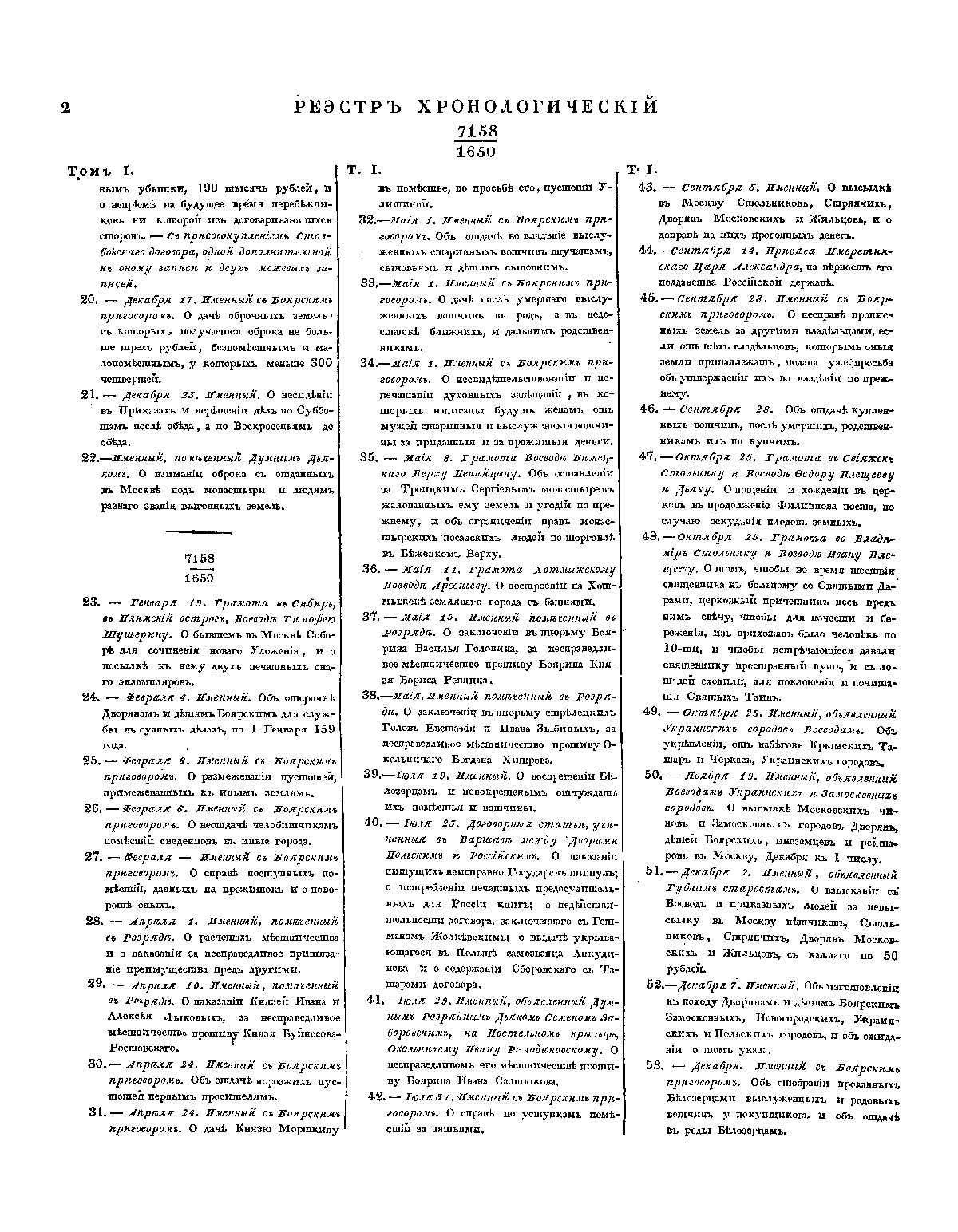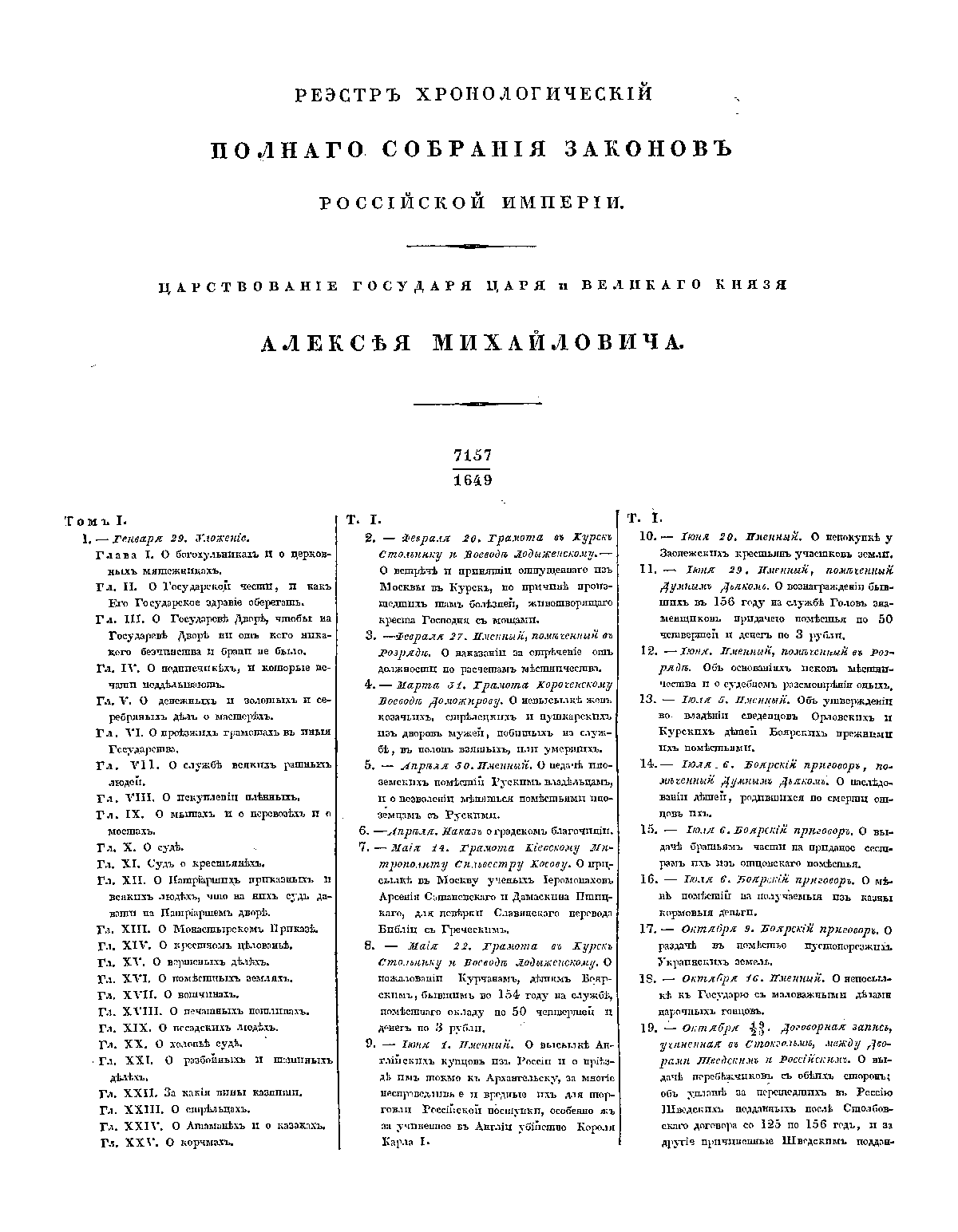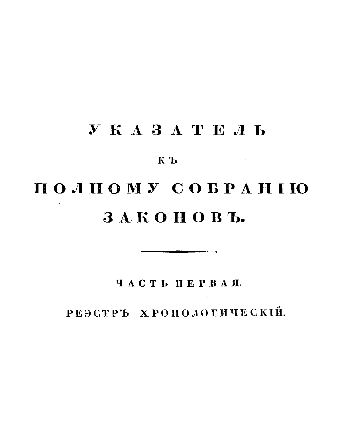 Первое издание 1830 г., составленное под руководством М. М. Сперанского, включает более 30 тысяч законодательных актов с 1649 по 1825 г (45 томов) — время правления Алексея Михайловича — Александра I (33 тома).