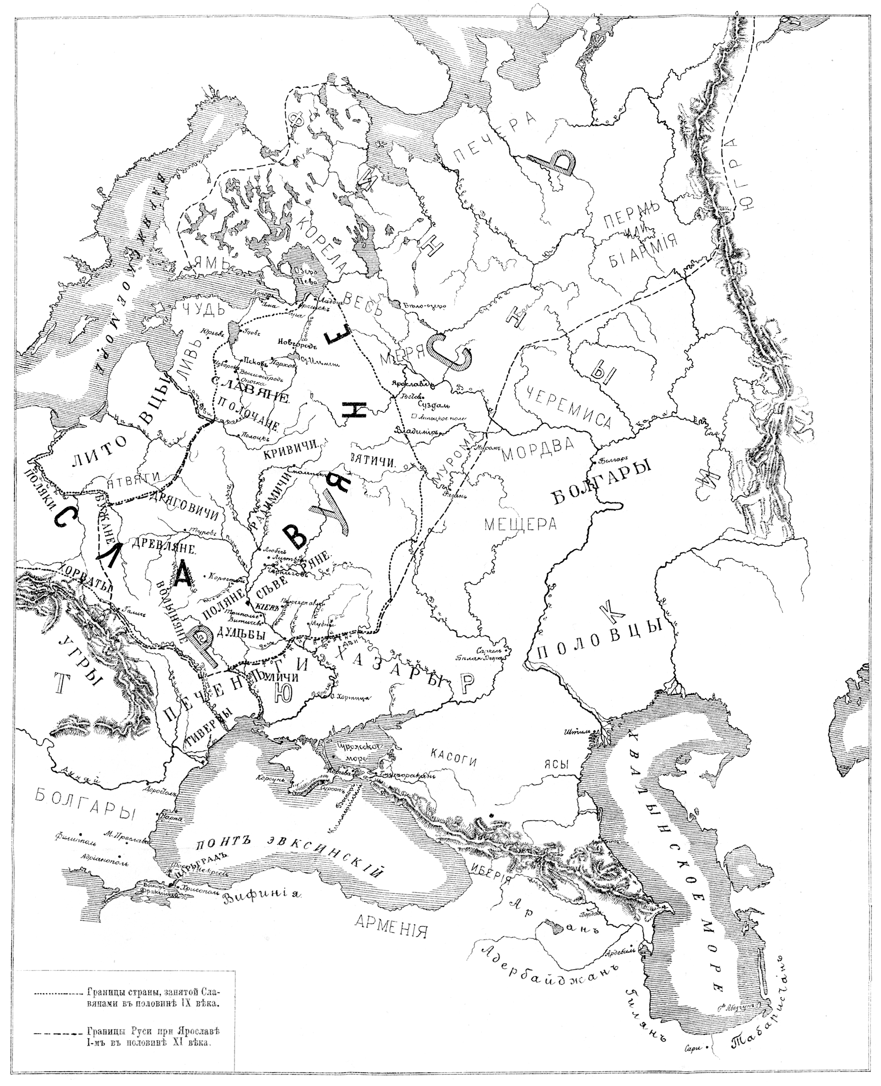 Границы страны, занятой славянами в IX веке и границы Руси при Ярославе I в первой половине XI века